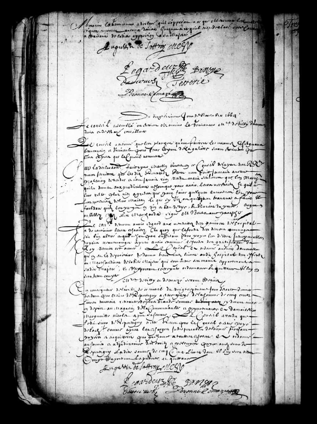 Transcription du texte avec orthographe modernisée : «Messieurs de Tilly et de Mazé se sont retirés. en conséquence de l'arrêt de ce conseil du vingt-septième jour d'août dernier tendant par le sieur de Repentigny à être payé de la somme de cinq cents livres tournois restante de plus grande somme ci-devant mise en dépôt an magasin de la communauté et appartenante à demoiselle Marguerite Nicolet à présent sa femme, le Conseil attendu que ledit sieur de Repentigny a été reçu par le Conseil à être payé de ladite somme après les charges indispensables de l'année prochaine payées et acquittées par préférence à toutes choses a ordonné au fermier et adjudicataire des droits et pelleteries payer audit sieur de Repentigny ladite somme de cinq cents livres dont il lui sera tenu compte rapportant la présente et quittance. AUGUSTIN DE SAFFRAY MESY LEGARDEUR DE TILLY, DAMOURS DENYS, PERONNE DEMAZÉ.»