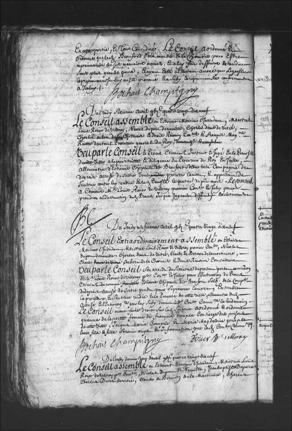 - Transcription du texte avec orthographe modernisée : «Du lundi dernier jour d'avril mille six cent quatre-vingt-dix-neuf. Le Conseil assemblé où étaient Monsieur l'intendant, maîtres Louis Rouer de Villeray premier conseiller Nicolas Dupont de Neuville, Jean-Baptiste Depeiras, Charles Denys de Vitré, Claude de Bermen de la Martinière, Charles Aubert de Lachesnais et Denis Riverin conseiller. Vu par le Conseil le procès criminel extraordinairement fait par le lieutenant général de la prévôté de cette ville à la requête du procureur du Roi en icelle demandeur et accusateur contre Etienne Chipault dit Beauport soldat de la compagnie de Degrais accusé de s'être pendu à une lisière pour se procurer la mort, et prisonnier des prisons royaux de ce palais défendeur et appelant de sentence contre lui rendue en ladite prévôté, ledit procureur du Roi aussi appelant a minima de ladite sentence, vu ladite sentence en date du quatrième avril de la [...]