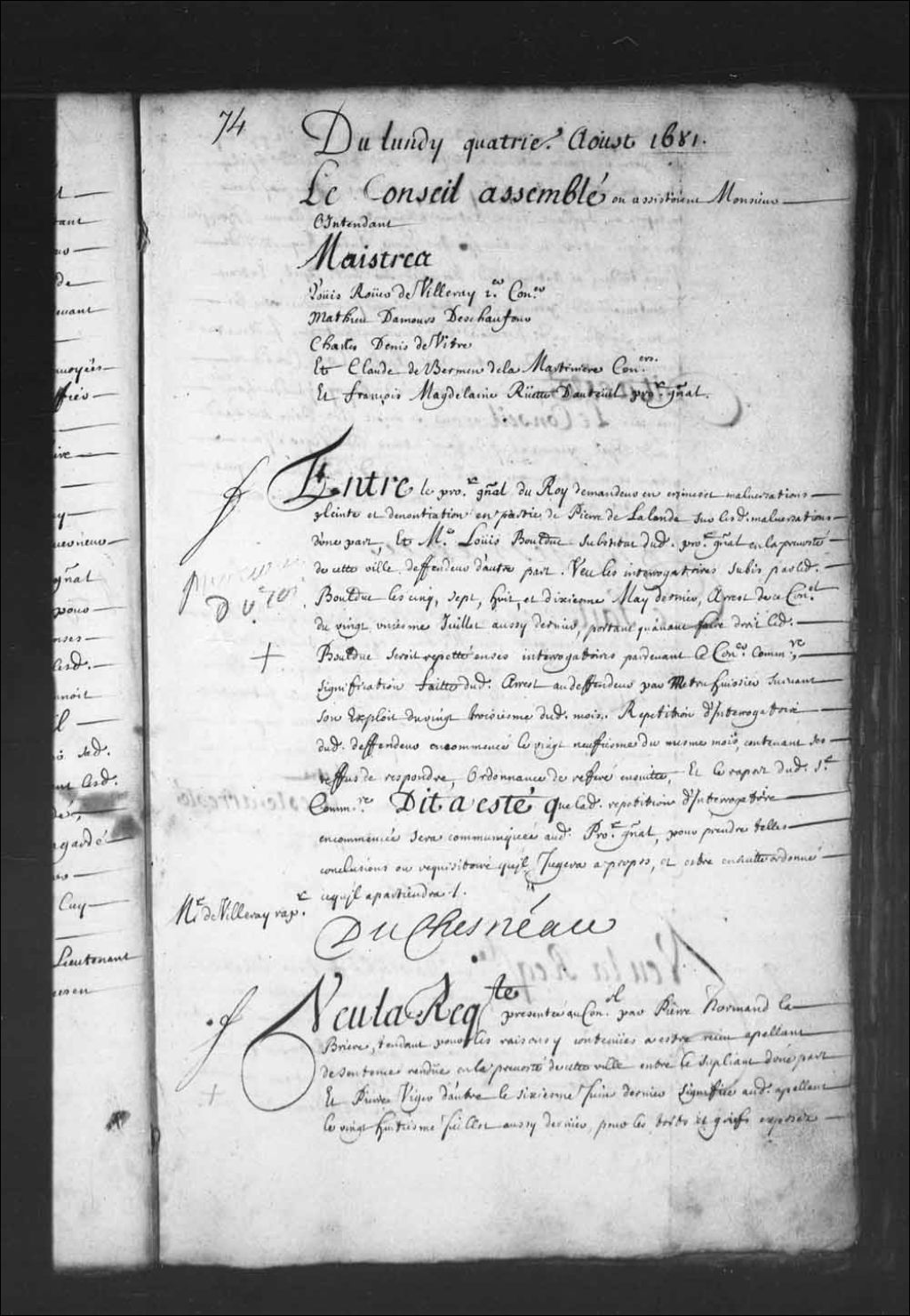 - Transcription du texte avec orthographe modernisée : «Du lundi quatrième août 1681. Le Conseil assemblé où assistaient Monsieur l'intendant. Maîtres. Louis Rouer de Villeray premier conseiller. Mathieu Damours Deschaufour. Charles Denys de Vitré. Et Claude de Bermen de la Martinière conseillers. Et François Madeleine Ruette d'Auteuil procureur général. Entre le procureur général du Roi demandeur en crimes et malversations, plainte et dénonciation en partie de Pierre de Lalande sur lesdites malversations d'une part; et maître Louis BOULDUC substitut dudit procureur général en la prévôté de cette ville défendeur d'autre part. Vu les interrogatoires subis par ledit Boulduc les cinq, sept, huit et dixième mai dernier, arrêt de ce Conseil du vingt et unième juillet aussi dernier, portant qu'avant faire droit ledit Boulduc serait répété en son interrogatoire par-devant le conseiller commissaire, signification faite dudit arrêt au défendeur par Metru huissier suivant son exploit du 23e dudit mois. Répétition d'interrogatoire dudit défendeur, encommencée le vingt-neuvième du même mois, contenant son refus de répondre, ordonnance de référé ensuite, et le rapport dudit sieur commissaire dit a été que ladite répétition d'interrogatoire encommencée sera communiquée audit procureur général pour prendre telles conclusions ou réquisitoire qu'il jugera à propos, et être ensuite ordonné ce qu'il appartiendra. Maître de Villeray rapporteur. DUCHESNEAU.»