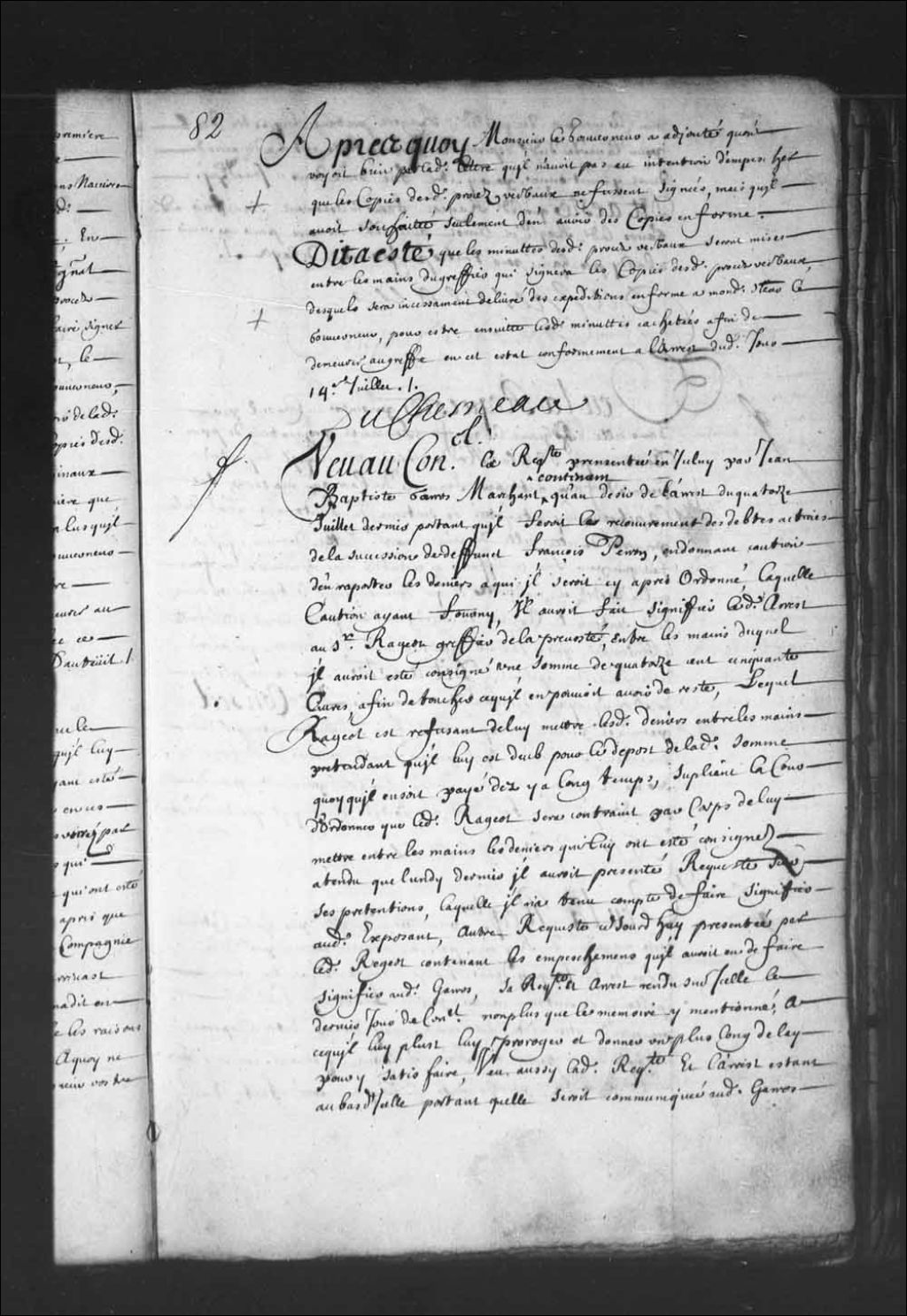 - Transcription du texte avec orthographe modernisée : «Vu au Conseil la requête présentée en icelui par Jean-Baptiste Garros marchand contenant qu'au désir de l'arrêt du quatorze juillet dernier portant qu'il ferait le recouvrement des dettes actives de la succession de défunt François Perron, en donnant caution d'en rapporter les deniers à qui il serait ci-après ordonné, laquelle caution ayant fourni il aurait fait signifier ledit arrêt au sieur Rageot greffier de la prévôté entre les mains duquel il aurait été consigné une somme de quatorze cent cinquante livres, afin de toucher ce qu'il en pouvait avoir de reste, lequel Rageot est refusant de lui mettre lesdits deniers entre les mains, prétendant qu'il est dû pour le dépôt de ladite somme quoi qu'il en soit payé dès y a longtemps, suppliant la Cour d'ordonner que ledit Rageot sera contraint par corps de lui mettre entre les mains les deniers qui lui ont été consignés attendu que lundi dernier il aurait présenté requête sur ses prétentions laquelle il n'a tenu compte de faire signifier audit exposant. Autre requête ce jourd'hui aussi présentée par ledit Rageot contenant les empêchements qu'il aurait eus de faire signifier audit Garros sa requête et arrêt rendu sur celle le dernier jour de Conseil, non plus que le mémoire y mentionné, à ce qu'il lui plût lui proroger et donner un plus long délai pour y satisfaire, vu aussi ladite requête et l'arrêt étant au bas d'icelle portant qu'elle serait communiquée audit Garros, avec le mémoire de ce que ledit Rageot prétend lui être dû pour la garde dudit dépôt, et pour les frais extraordinaires du décret y mentionné, pour y être fait droit dans ce jourd'hui. Dit a été que ledit Rageot fera incessamment signifier audit Garros ladite requête et arrêt avec ledit mémoire, pour en venir à lundi prochain pour toutes préfixions et délais. DUCHESNEAU.»