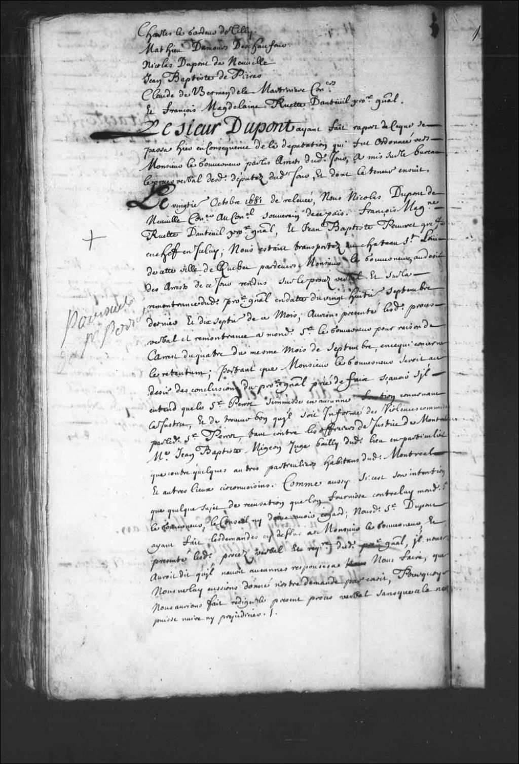 - Transcription du texte avec orthographe modernisée : «Du mardi vingt et unième desdits mois et an. Le Conseil assemblé extraordinairement où assistaient Monsieur l'évêque de Québec. Monsieur l'intendant. Maîtres. Louis Rouer de Villeray premier conseiller. Charles Legardeur de Tilly. Mathieu Damours Deschaufour. Nicolas Dupont de Neuville. Jean-Baptiste Depeiras. Claude de Bermen de la Martinière conseillers. Et François Madeleine Ruette d'Auteuil procureur général. Le sieur DUPONT ayant fait rapport de ce qui se passa hier en conséquence de la députation qui fut ordonnée vers Monsieur le gouverneur par les arrêts dudit jour a mis sur le bureau le procès-verbal desdits députés dudit jour, et dont la teneur ensuit. Le vingtième octobre mille six cent quatre-vingt et un de relevée, nous Nicolas Dupont de Neuville conseiller au Conseil souverain de ce pays, François Madeleine Ruette d'Auteuil procureur général et Jean-Baptiste Peuvret [...]