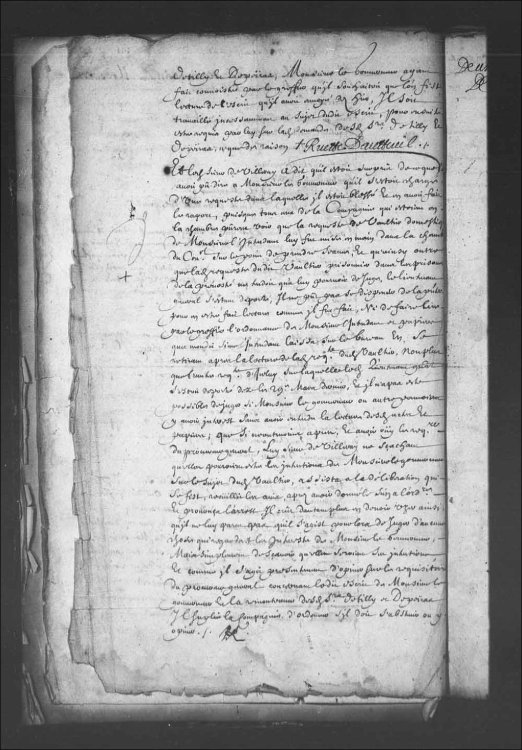 - Transcription du texte avec orthographe modernisée : «Et ledit sieur de Villeray a dit qu'il était surpris de ce que l'on avait pu dire à Monsieur le gouverneur qu'il s'était chargé d'une requête dans laquelle il était blessé et en avait fait le rapport, puisque tous ceux de la compagnie qui étaient en la chambre purent voir que la requête de vautier domestique de Monsieur l'intendant lui fut mise en main dans la chambre du Conseil sur le point de prendre séance, et qu'ainsi outre que ladite requête dudit vautier prisonnier dans les prisons de la prévôté ne tendait qu'à lui pourvoir de juge, le lieutenant général s'étant déporté, il ne put pas se dispenser de la présenter pour en être fait lecture comme il fut fait, Ni de faire lire par le greffier l'ordonnance de Monsieur l'intendant et papiers que mondit sieur l'intendant laissa sur le bureau en se retirant après la lecture de ladite requête dudit vautier, non plus que l'autre requête [...]