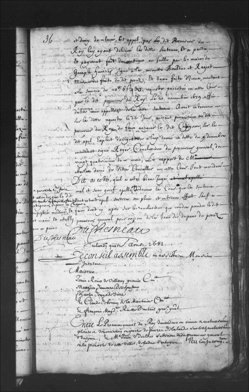 - Transcription du texte avec orthographe modernisée : «Du lundi quatrième août 1681. Le Conseil assemblé où assistaient Monsieur l'intendant. Maîtres. Louis Rouer de Villeray premier conseiller. Mathieu Damours Deschaufour. Charles Denys de Vitré. Et Claude de Bermen de la Martinière conseillers. Et François Madeleine Ruette d'Auteuil procureur général. Entre le procureur général du Roi demandeur en crimes et malversations, plainte et dénonciation en partie de Pierre de Lalande sur lesdites malversations d'une part; et maître Louis BOULDUC substitut dudit procureur général en la prévôté de cette ville défendeur d'autre part. Vu les interrogatoires subis par ledit Boulduc les cinq, sept, huit et dixième mai dernier, arrêt de ce Conseil du vingt et unième juillet aussi dernier, portant qu'avant faire droit ledit Boulduc serait répété en son interrogatoire par-devant le conseiller commissaire, signification faite dudit arrêt au défendeur [...]