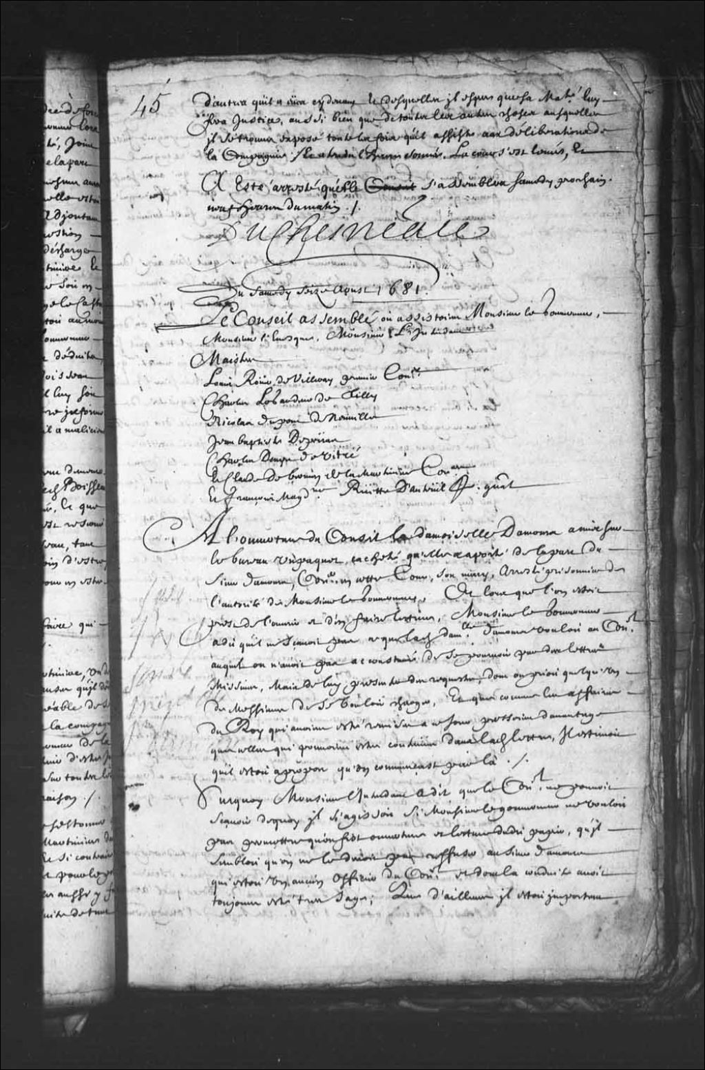 - Transcription du texte avec orthographe modernisée : «Du samedi seize août 1681. Le Conseil assemblé où assistaient Monsieur le gouverneur, Monsieur l'évêque, Monsieur l'intendant. Maîtres. Louis Rouer de Villeray premier conseiller. Charles LeGardeur de Tilly. Nicolas Dupont de Neuville. Jean-Baptiste Depeiras. Charles Denys de Vitré. Et Claude de Bermen de la Martinière conseillers. Et François Madeleine Ruette d'Auteuil procureur général. À l'ouverture du Conseil la demoiselle Damours a mis sur le bureau un paquet cacheté qu'elle a apporté de la part du sieur Damours, conseiller en cette Cour, son mari, arrêté prisonnier de l'autorité de Monsieur le gouverneur, et lors que l'on était près de l'ouvrir et d'en faire lecture, Monsieur le gouverneur a dit qu'il ne savait pas ce que ladite demoiselle Damours voulait au Conseil auquel on n'avait pas accoutumé de se pourvoir par des lettres missives, mais de lui présenter des requêtes, dont [...]