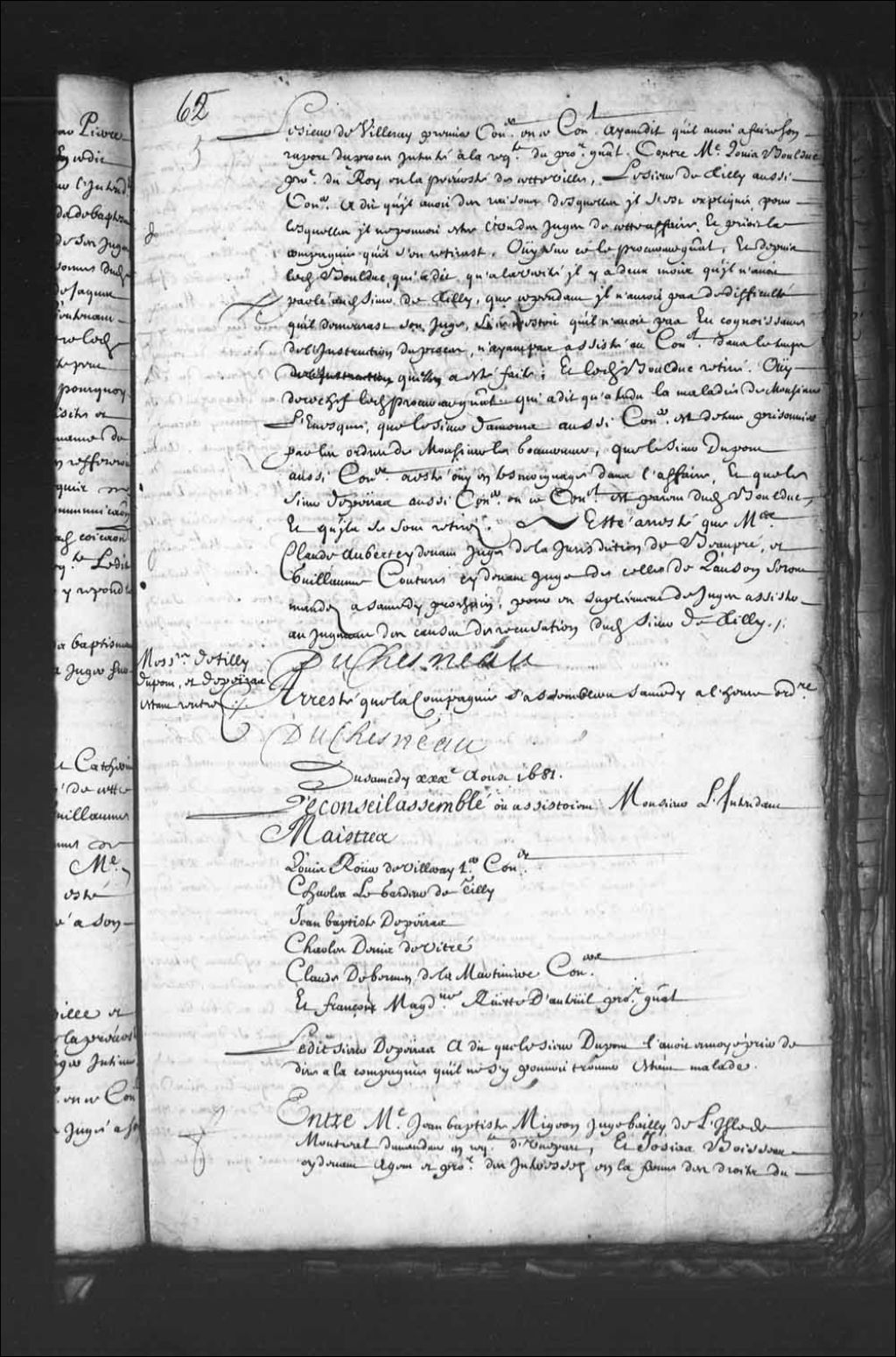 Arrêt mandatant en supplément de juges, Me Claude Aubert, juge de Beaupré, et Guillaume Couture, juge de Lauzon, pour assister au jugement des causes de récusations du sieur de Tilly, dans l'affaire du procureur général contre le procureur du Roi en la Prévôté de Québec, Me Louis Bolduc, vu la maladie de Monsieur l'Évêque, que le sieur Damours est détenu prisonnier et que le sieur de Peiras est parent du dit Bolduc, 26 août 1681, Archives nationales à Québec, Fonds Conseil souverain, (03Q,TP1,S28,P3011).
