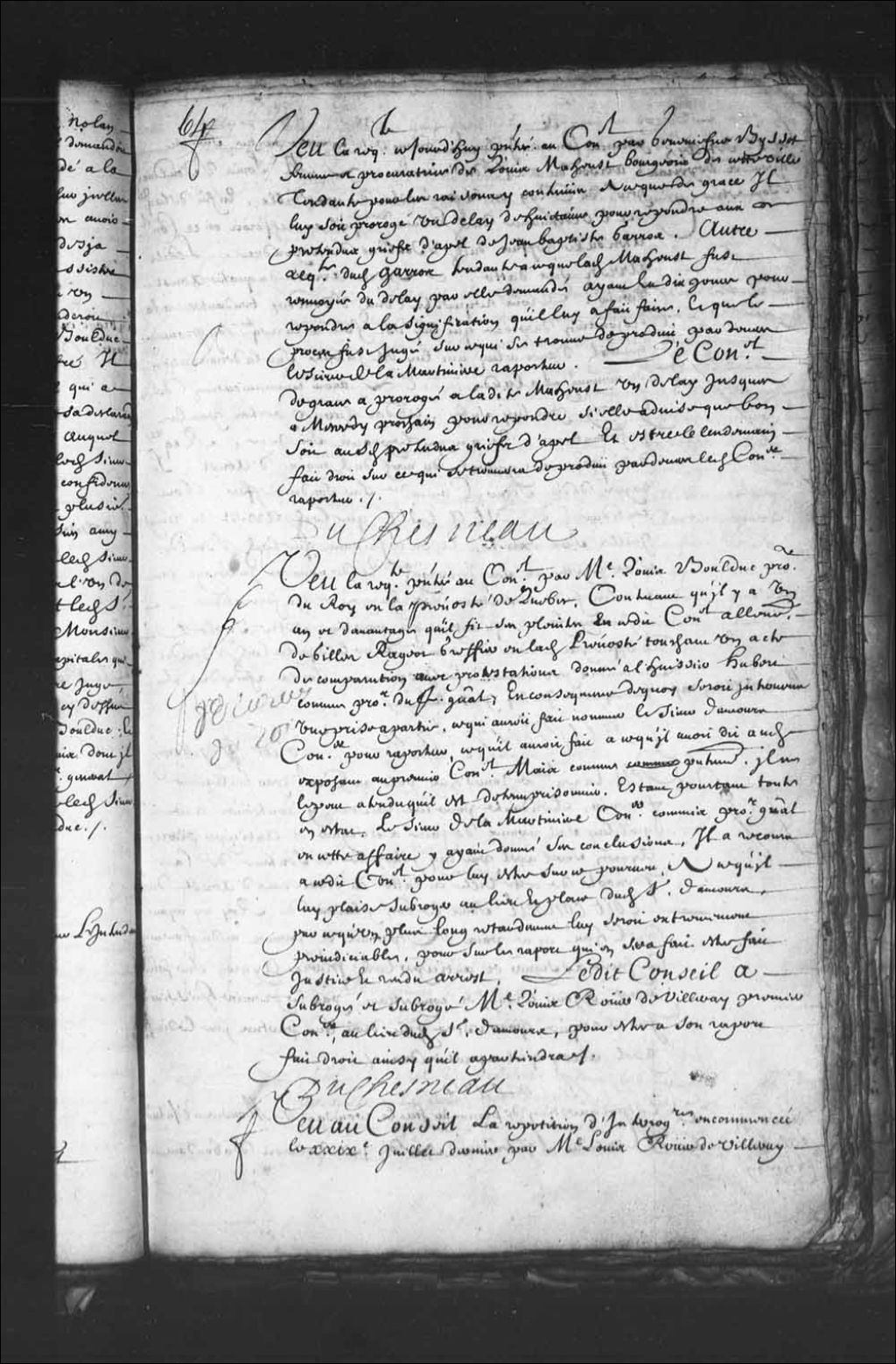 - Transcription du texte avec orthographe modernisée : «Les sieurs de Tilly, Dupont et Depeiras se sont retirés. Vu au Conseil la répétition d'interrogatoire encommencée le 29e juillet dernier par maître Louis Rouer de Villeray premier conseiller en icelui commis. en cette partie suivant l'arrêt du 21e dudit mois à maître Louis Boulduc (Bolduc) procureur du Roi en la prévôté de cette ville, en fin de laquelle est l'ordonnance dudit commissaire qu'il en référerait en ce Conseil attendu le refus dudit Boulduc de répondre. Ledit arrêt sus-daté. Autre arrêt du quatre août dernier. trois requêtes dudit Boulduc tendantes à la disjonction du procès qui lui est fait à la requête du procureur général d'avec celui qui lui est intenté sur la dénonciation du nommé Lalande; à avoir communication de l'interrogatoire par lui subi, et des charges portées par les informations, et à ce que le procès soit jugé. Registre dudit procureur général du neuf dudit mois d'août, le rapport dudit sieur commissaire sur sondit référé. Tout considéré. Dit a été que ledit arrêt du vingt juillet sera exécuté, et en ce faisant que ledit Boulduc sera répété en ses interrogatoires, et de nouveau interrogé tant sur les faits résultant des charges et informations contre lui faites, qu'autres qui pourraient être supplées d'office par le sieur commissaire sur lesquelles ledit Boulduc répondra positivement, et jusqu'à ce, sursis à faire droit sur les requêtes par lui présentées. Monsieur de Villeray rapporteur. DUCHESNEAU ROUER DE VILLERAY.»