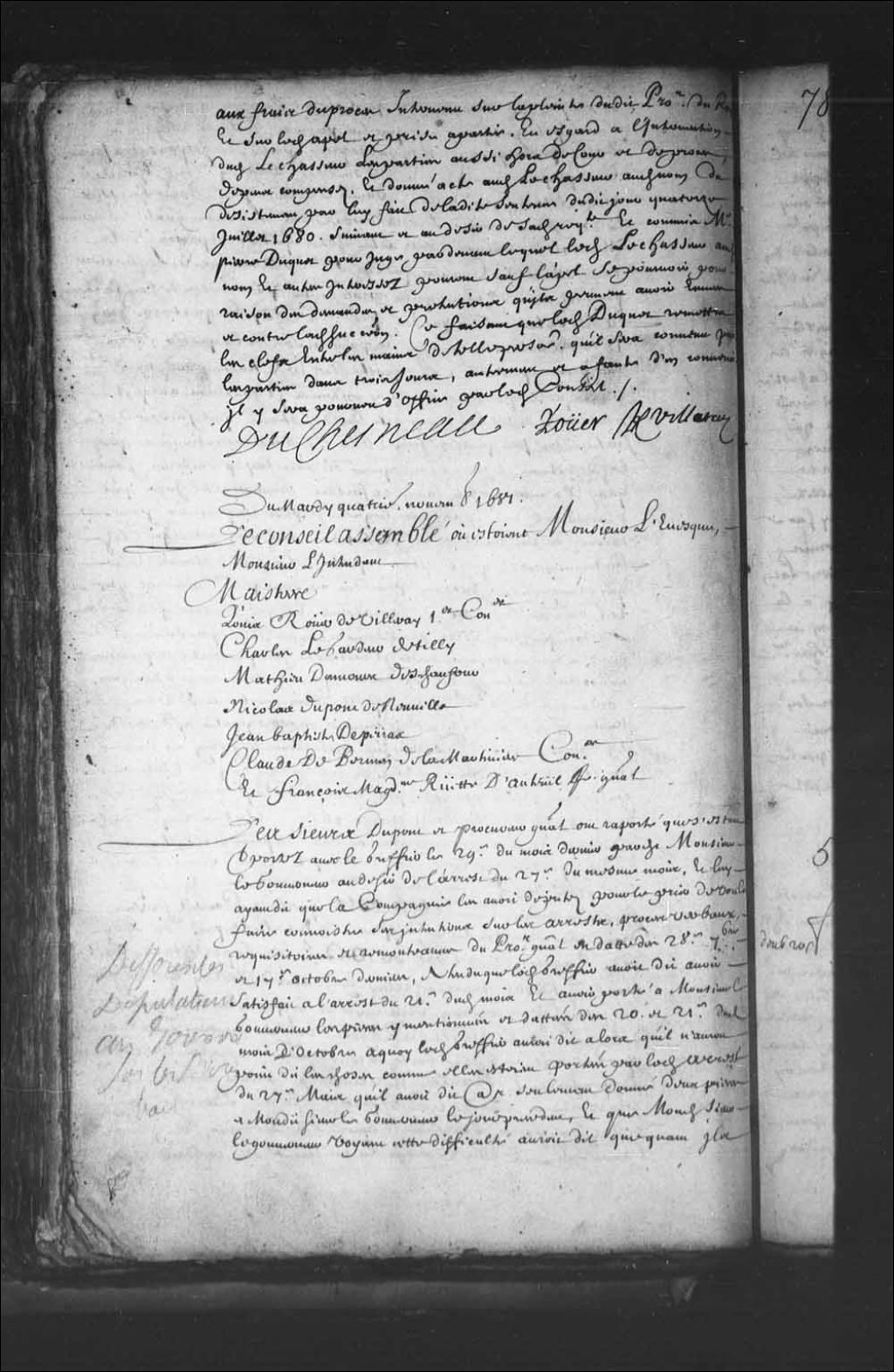 Transcription du texte avec orthographe modernisée : «Du mardi quatrième novembre 1681. Le Conseil assemblé où étaient Monsieur l'évêque, Monsieur l'intendant. Maîtres. Louis Rouer de Villeray premier conseiller. Charles LeGardeur de Tilly. Mathieu Damours Deschaufour. Nicolas Dupont de Neuville. Jean-Baptiste Depeiras. Claude de Bermen de la Martinière conseillers. Et François Madeleine Ruette d'Auteuil procureur général. Les sieurs Dupont et procureur général ont rapporté que s'étant transportés avec le greffier le 29e du mois dernier par devers Monsieur le gouverneur au désir de l'arrêt du 27e du même mois, et lui ayant dit que la compagnie les avait députés pour le prier de vouloir faire connaître ses intentions sur les arrêts, procès-verbaux, réquisitoires et remontrances du procureur général en date du 28e septembre et 17e octobre dernier, attendu que ledit greffier avait dit avoir satisfait à l'arrêt du 21e dudit mois et avoir porté à Monsieur le gouverneur les pièces y mentionnées et datées des 20 et 21e dudit mois d'octobre à quoi ledit greffier aurait dit alors qu'il n'aurait point dit les choses comme elles étaient portées par ledit arrêt du 27e mais qu'il avait dit avoir seulement donné deux pièces à mondit sieur le gouverneur le jour précédent, et que mondit sieur le gouverneur voyant cette difficulté aurait dit que quand ils seraient convenus il répondrait, et se seraient retirés sur quoi Monsieur l'intendant a dit au greffier que ce fût lui dit greffier qui écrivit ce qui est porté par l'arrêt dudit jour 27e, dans lequel il est dit en termes exprès qu'après que ledit greffier avait dit avoir satisfait à l'arrêt du 21e de ce mois, et avoir porté à Monsieur le gouverneur le jour précédent quatre heures de relevée les pièces y mentionnées et datées desdits jours 20 et 21e du mois passé, ledit greffier ait à déclarer qu'elles pièces il s'était oublié de porter à mondit sieur le gouverneur. À quoi ledit greffier a répondu qu'il n'avait point prétendu parler que des deux pièces datées des 20 et 21e dudit mois qu'il porta seulement, et qu'il ne savait pas s'il y en avait d'autres. Ensuite le procureur général a dit qu'il supplie le Conseil de le dispenser d'aller dorénavant en députation par devers Monsieur le gouverneur pour les injures, mauvais traitements et menaces qu'il lui fait lors qu'il a cet honneur, ce qui est arrivé tout récemment ledit jour 29e qu'il prie le Conseil de l'exempter de rapporter, crainte de l'aigrir tout de nouveau contre lui demandant au surplus que le greffier ait à lui délivrer toutes les pièces concernant l'affaire en question, et que mondit sieur le gouverneur soit supplié de déclarer qu'elles sont ses intentions sur cette affaire. Dit a été que les sieurs de Villeray et Dupont conseillers avec le greffier porteront présentement à Monsieur le gouverneur la feuille de ce qui s'est passé au Conseil à cet égard, et que puisque le procureur général a fait connaître à Monsieur le gouverneur qu'il était la partie du sieur Perrot et qu'il l'accusait de violences, mondit sieur le gouverneur sera prié par lesdits sieurs de Villeray et Dupont de faire connaître ses intentions sur les pièces qu'il demande, afin de faire savoir ensuite sa volonté sur ladite affaire. DUCHESNEAU.»