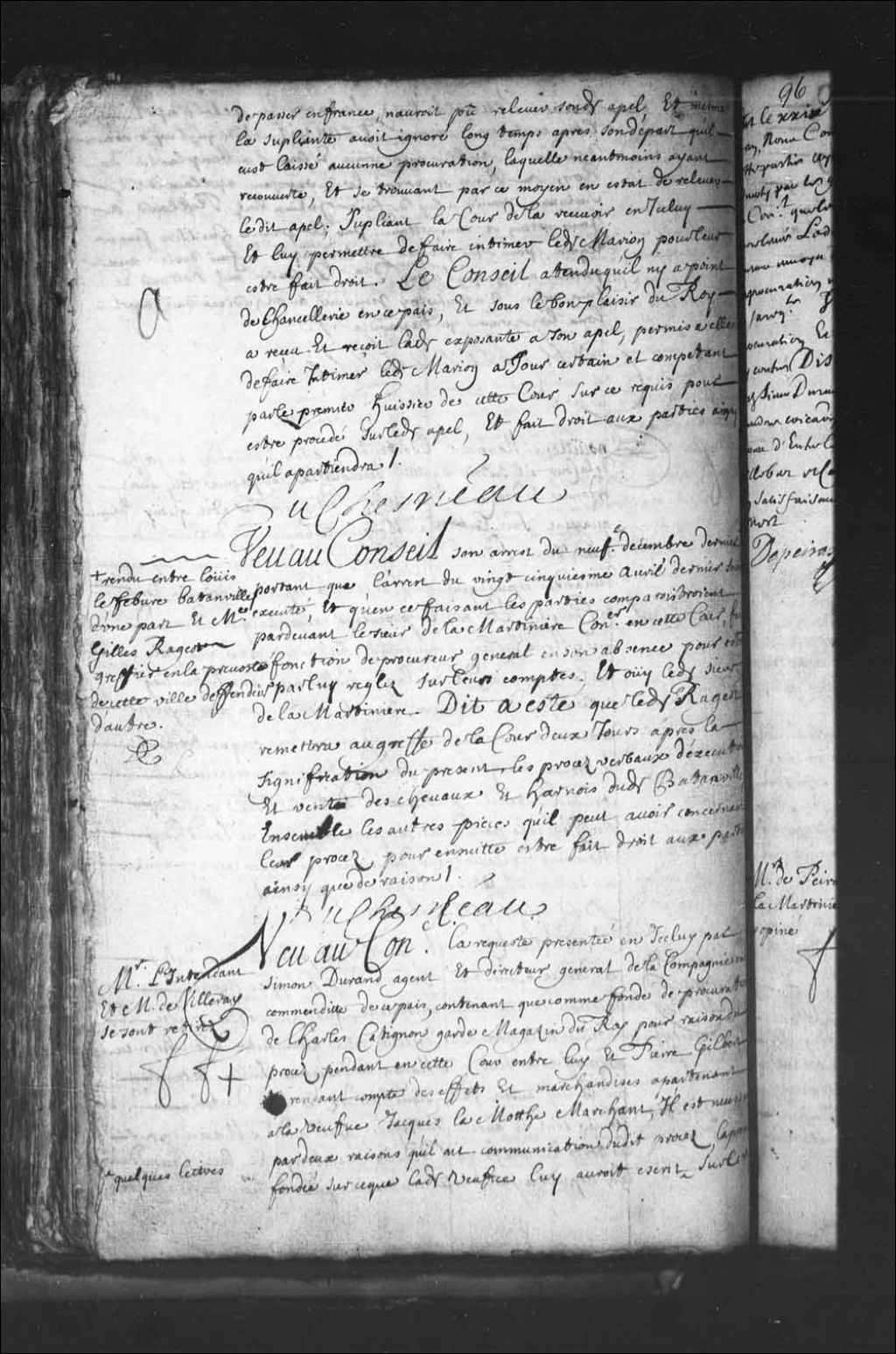 - Transcription du texte avec orthographe modernisée : «Monsieur l'intendant et Monsieur de Villeray se sont retirés. Vu au Conseil la requête présentée en icelui par Simon Durand agent et directeur général de la compagnie en commandite de ce pays, contenant que comme fondé de procuration de Charles Catignon garde magasin du Roi pour raison du procès pendant en cette Cour entre lui et Pierre Gilbert rendant compte des effets et marchandises appartenant à la veuve Jacques LaMothe marchand, il est nécessaire par deux raisons qu'il ait communication dudit procès, la première fondée sur ce que ladite veuve lui aurait écrit quelques lettres sur le sujet qui portent quelques instructions, desquelles il n'a pu conférer avec ledit Catignon à cause du peu de temps qu'il y avait au départ des vaisseaux, et de la quantité d'affaires que l'on a en ce temps la, et ainsi n'a pu s'instruire pour lors du mérite de l'affaire, la seconde qu'il a recouvert [...]