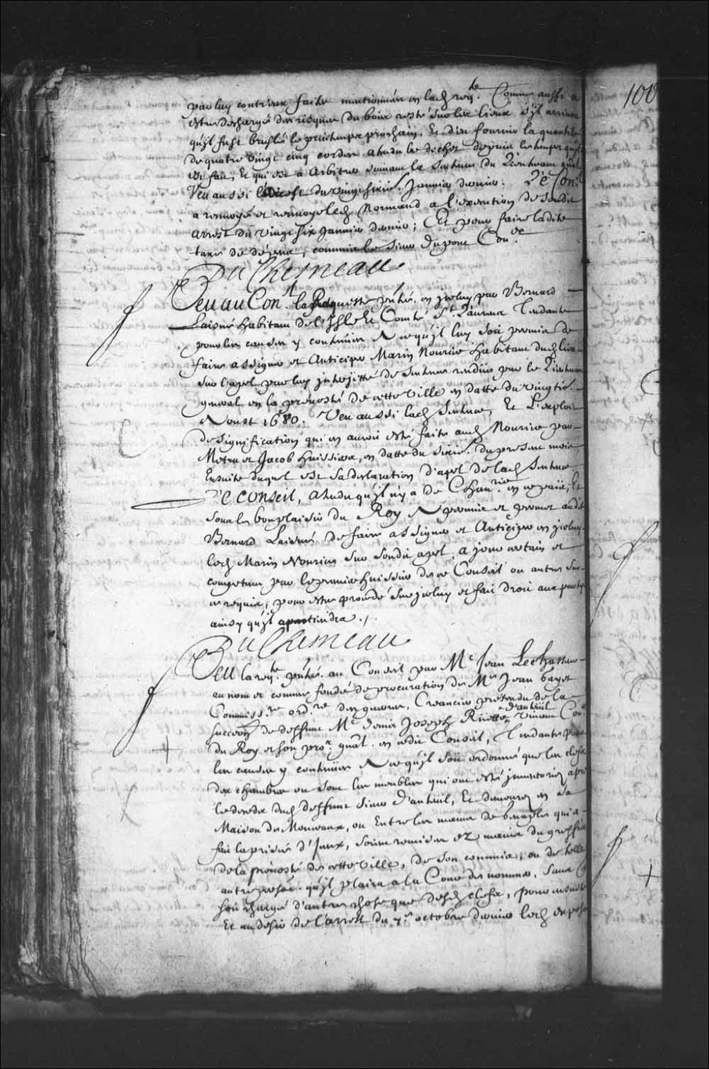 - Transcription du texte avec orthographe modernisée : «Vu la requête présentée au Conseil par maître Jean Lechasseur au nom et comme fondé de procuration de maître Jean Gayet commissaire ordinaire des guerres, créancier prétendu de la succession de défunt maître Denis Joseph Ruette d'Auteuil vivant conseiller du Roi et son procureur général en ce dit Conseil, tendante pour les causes y contenues à ce qu'il soit ordonné que les clefs des chambres ou sont les meubles qui ont été inventoriés après le décès dudit défunt sieur d'Auteuil, et demeurés en sa maison de Monceaux, ou entre les mains de genaple qui a fait la prisée d'iceux, soient remises en les mains du greffier de la prévôté de cette ville, de son commis ou de telle autre personne qu'il plaira à la Cour de nommer, sans qu'il soit chargé d'autre chose que desdites clefs, pour ensuite et au désir de l'arrêt du 7e octobre dernier ledit exposant se pourvoir par-devant maître Pierre Duquet commis pour juge, sauf l'appel, la demande nouvelle qu'il a intentée comme il avisera bon être, vu aussi ledit arrêt ci-dessus daté, et la réponse de René Hubert huissier en cette Cour comme procureur constitué, par maître François Madeleine Ruette d'Auteuil conseiller de sa Majesté et son procureur général en cette dite Cour, faisant pour la dame veuve d'Auteuil sa mère opposante au scellé apposé après le décès dudit défunt sieur d'Auteuil, ladite réponse signifiée audit sieur Lechasseur par l'huissier Roger le septième de ce mois, tout considéré. Dit a été que lesdites clefs seront remises en les mains du greffier que prendra ledit sieur Duquet, sauf audit sieur LeChasseur de se pourvoir au surplus ainsi qu'il avisera bon être. DUCHESNEAU.»