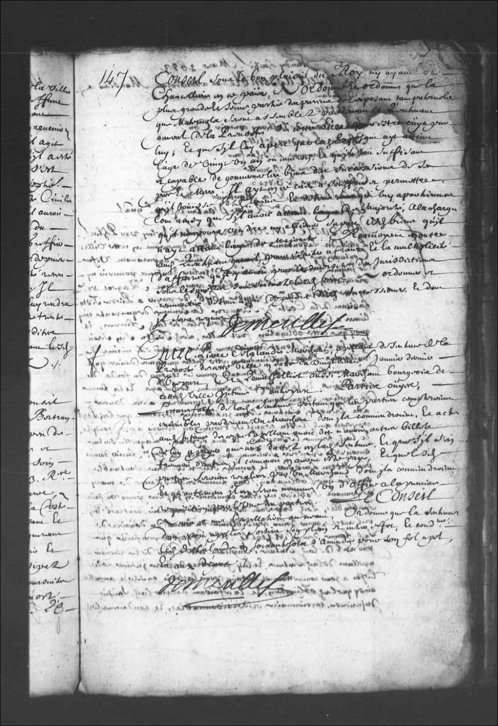 Transcription du texte avec orthographe modernisée : «Entre Pierre de LALANDE marchand, appelant de sentence de la prévôté de cette ville en date du vingt-deuxième janvier dernier d'une part, et Louis JOLLIET aussi marchand bourgeois de cette ville intimé d'autre part. Parties ouïes, lecture faite de ladite sentence portant que les parties compteraient ensemble par-devant un marchand dont ils conviendraient, et acte audit intimé de ce que l'appelant avait dit n'avoir autres billets de lui à payer que ceux datés en ladite sentence, et que s'il s'en trouvait d'autres, il convenait en avoir été payé, et que lesdites parties seraient réglées par un marchand dont ils conviendraient et qu'autrement il en serait nommé un d'office à la première réquisition par l'une des parties. Le Conseil a mis et met l'appellation au néant, ordonne que la sentence dont était appelé sortira son plein et entier effet, et condamne ledit de Lalande en soixante sols d'amende pour son fol appel, et aux dépens. DEMEULLE.»