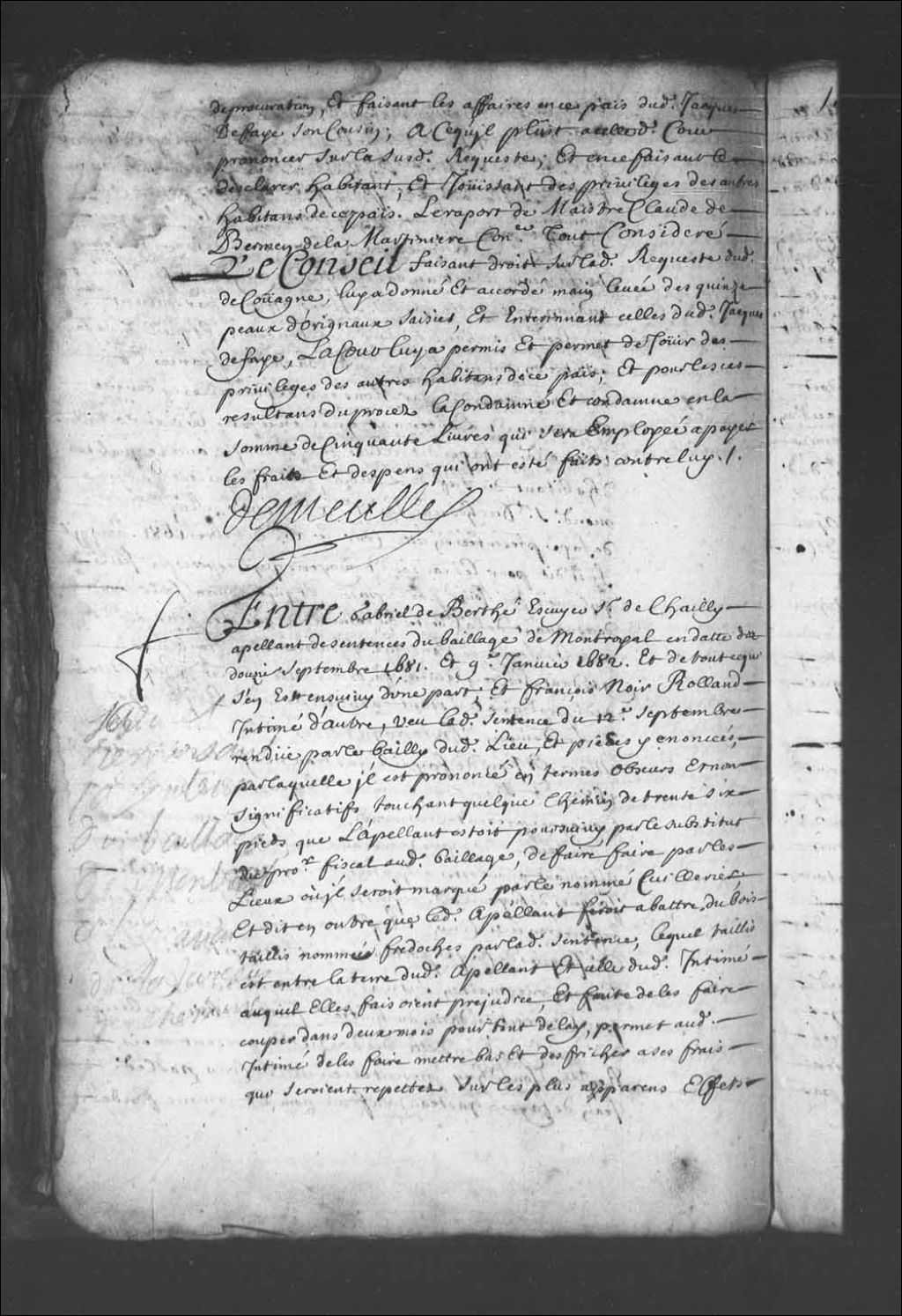 - Appel de Gabriel de Berthé, écuyer et sieur de Chailly, contre François Noir Rolland maintenu, et permission au dit sieur de Chailly laisser revenir le bois taillé sur son terrain avoisinant celui du dit Rolland; ordonné que les termes irrespectueux dont le dit Rolland s'est servi seront rayés de ses écritures; condamnation du dit Rolland à s'excuser et à payer la somme de 100 livres comme réparation civile; et à l'égard du substitut du Procureur fiscal qui a fait fonction de juge en l'absence du bailli de Montréal, le Conseil le condamne à restituer aux parties ce qu'il a touché pour ses vacations et ordonne qu'il recevra réprimande pour son mauvais jugement et attentat au préjudice du dit appel par Monsieur l'Intendant