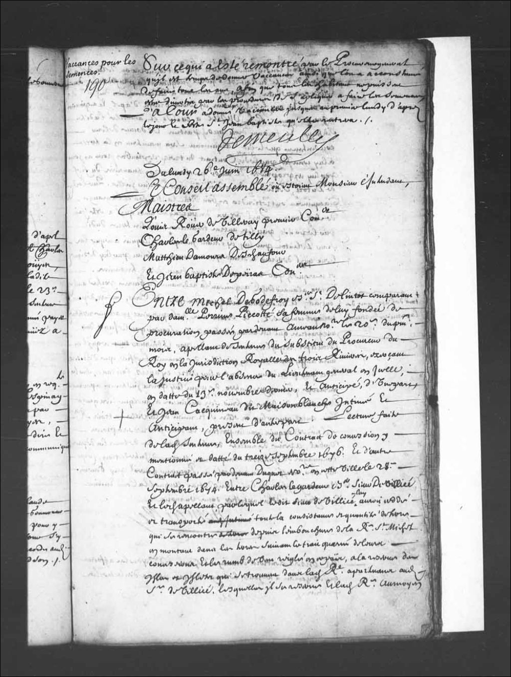 Transcription du texte avec orthographe modernisée : «Du lundi 26e juin 1684. Le Conseil assemblé où étaient Monsieur l'intendant. Maîtres. Louis Rouer de Villeray premier conseiller. Charles Legardeur de Tilly. Mathieu Damours Deschaufour. Et Jean-Baptiste Depeiras conseillers. Entre Michel de GODEFROY écuyer sieur de Linctot comparant par demoiselle Perinne Piccotté sa femme de lui fondée de procuration passé par-devant Ameau notaire le 20e du présent mois, appelant de sentence du substitut du procureur du Roi en la juridiction royale des Trois-Rivières, exerçant la justice pour l'absence du lieutenant général en icelle en date du 13e novembre dernier, et anticipé, d'une part et Jean CACQUINEAU dit maison BLANCHE intimé et anticipant, présent d'autre part. Lecture faite de ladite sentence, ensemble du contrat de concession y mentionné et daté du treize septembre 1676. Et d'autre contrat passé par-devant Duquet notaire en cette ville [...]