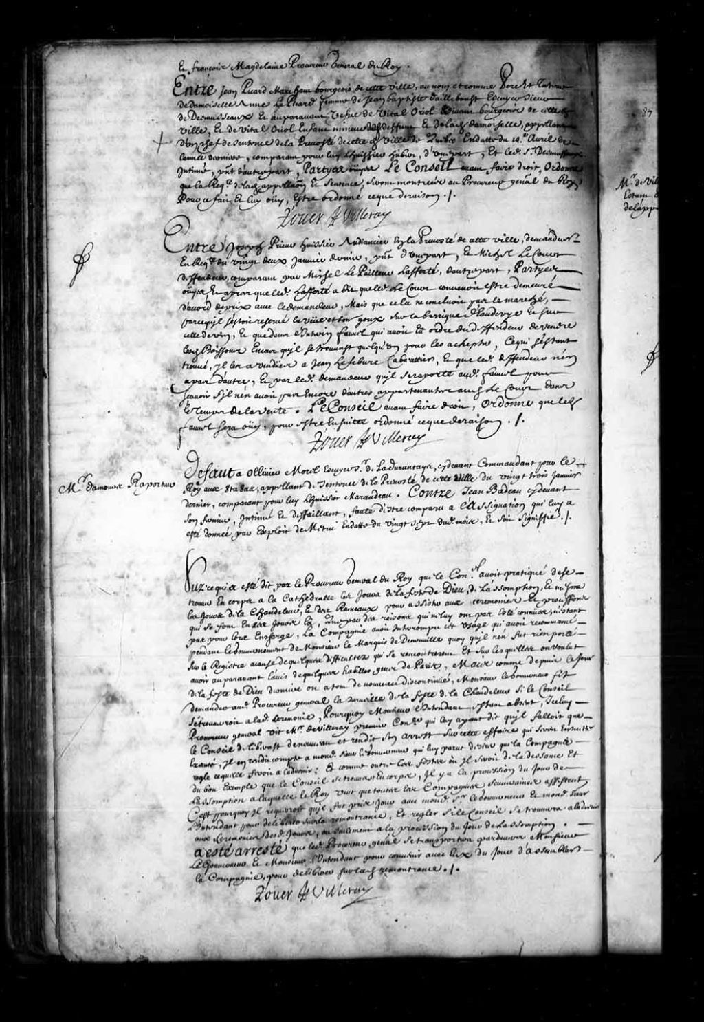 - Transcription du texte avec orthographe modernisée : «Entre Joseph PRIEUR huissier audiencier en la prévôté de cette ville demandeur en requête du vingt-deux janvier dernier, présent d'une part, et Michel LECOURT défendeur, comparant par Michel LePailleur Lafferté, d'autre part. Parties ouïes, et après que ledit Lafferté a dit que ledit LeCourt convenait être demeuré d'accord de prix avec le demandeur, mais que cela ne concluait pas le marché, parce qu'il s'était réservé la vue et son goût sur la barrique d'eau-de-vie et sur celle de vin, et que dans l'intérim Fauvel qui avait eu ordre du défendeur de vendre lesdites boissons en cas qu'il se trouvât quelqu'un pour les acheter, ce qui s'étant trouvé, il les a vendues à Jean Lefebvre cabaretier, et que ledit défendeur n'en a pas d'autre, et par ledit demandeur qu'il se rapporte audit Fauvel pour savoir s'il n'en avait pas encore d'autres appartenantes audit LeCourt dans le temps de la vente. Le Conseil avant faire droit, ordonne que ledit Fauvel sera ouï, pour être ensuite ordonné ce que de raison. ROUER DE VILLERAY.»