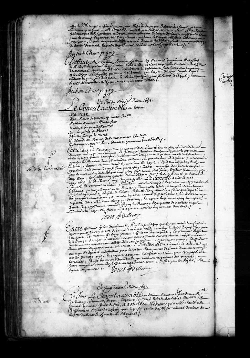 - Transcription du texte avec orthographe modernisée : «Du lundi seizième juillet 1691. Le Conseil assemblé où étaient Maîtres Louis Rouer de Villeray premier conseiller. Mathieu Damours Dechaufour. Nicolas Dupont de Neuville. Jean-Baptiste Depeiras. Charles Denys de Vitré. Et Claude de Bermen de la Martinière conseillers. Et François Madeleine Ruette d'Auteuil procureur général du Roi. Monsieur de Vitré s'est retiré. Entre Michel LE MARIÉ appelant de sentence de la prévôté de cette ville, en date du dixième du présent mois, présent d'une part, et Guillaume Bouthier marchand bourgeois de cette ville intimé, aussi présent d'autre part; lecture faite de ladite sentence portant que l'intimé ferait approcher les témoins dont il entendait se servir, au premier jour, des pièces y mentionnées et datées, d'autre sentence datée en celle dont est appel. Et d'une obligation dudit appelant de la somme de neuf cent quatre-vingt livres, au profit de l [...]