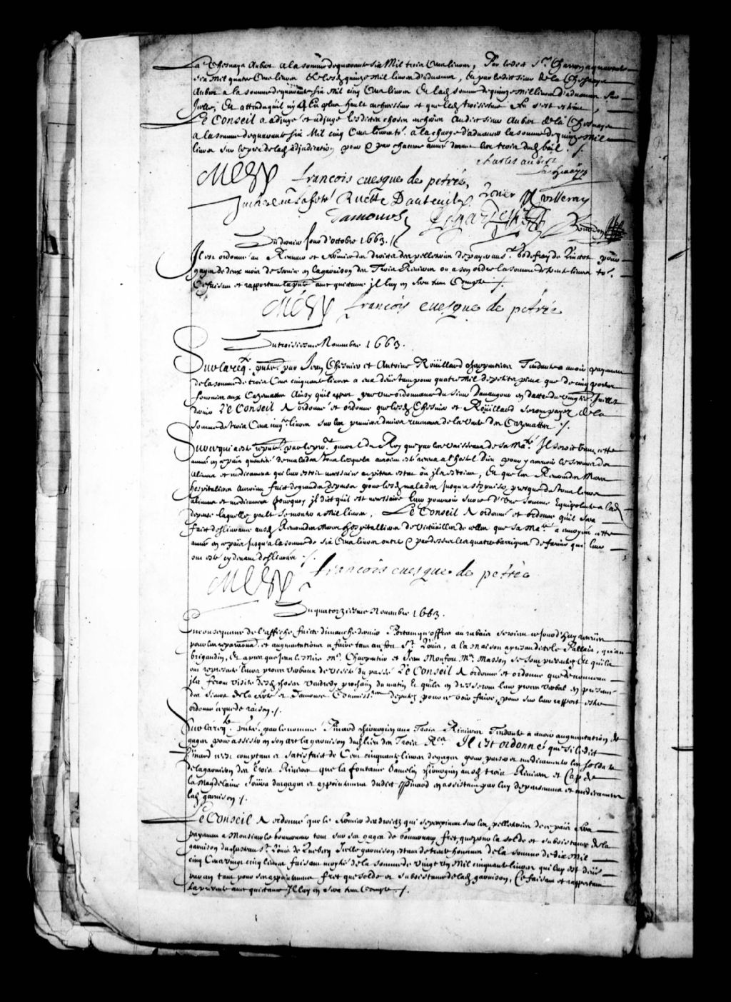 Transcription du texte avec orthographe modernisée : «Du quatorzième novembre 1663. En conséquence de l'affiche faite dimanche dernier portant qu'offres au rabais seraient ce jourd'hui reçues pour les réparations et augmentations à faire tant au fort Saint-Louis, à la maison à présent dite le Palais, qu'au brigantin, et après que Jean Lemire maître charpentier et Jean Monfort maître maçon se sont présentés et qu'ils ont représenté leur procès-verbaux de visite du passé. Le Conseil a ordonné et ordonne que de nouveau ils feront visite desdites choses vendredi prochain du matin et qu'ils en dresseront leur procès-verbal en présence des sieurs de LaFerté et Damours commissaires députés pour ce voir faire, pour sur leur rapport être ordonné ce que de raison.»
