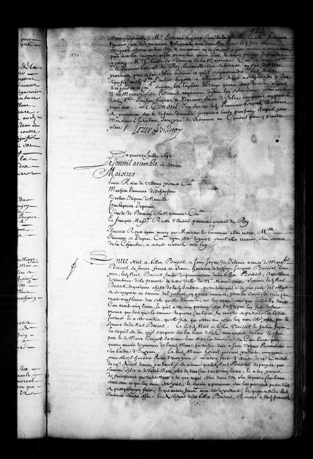 Transcription du texte avec orthographe modernisée : «Du quatorze juillet 1692. Le Conseil assemblé où étaient Maîtres Louis Rouer de Villeray premier conseiller. Mathieu Damours Deschaufour. Nicolas Dupont de Neuville. Jean-Baptiste Depeiras. Claude de Bermen, de la Martinière conseillers. Et François Madeleine Ruette d'Auteuil procureur général du Roi. L'huissier ROGER ayant averti que Monsieur le gouverneur allait entrer Messieurs Damours et Dupont conseillers ayant été députés pour l'aller recevoir, sont sortis de la chambre, et ensuite rentrés avec lui.»