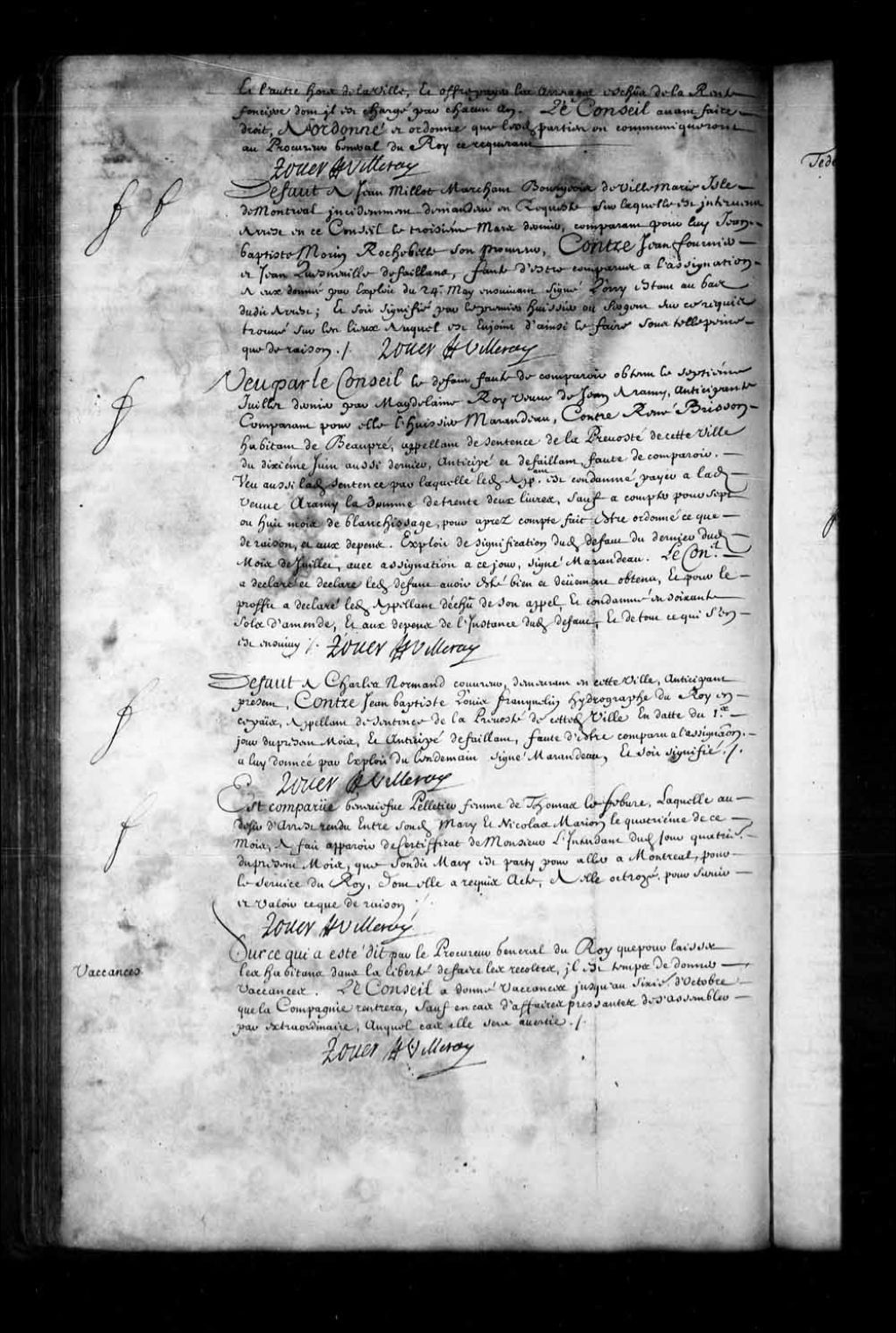 Transcription du texte avec orthographe modernisée : «Défaut à Jean Millot (Milot) marchand bourgeois de Ville-Marie île de Montréal incidemment demandeur en requête sur laquelle est intervenu arrêt en ce Conseil le troisième mars dernier, comparant pour lui Jean-Baptiste Morin Rochebelle son procureur, contre Jean Fournier et Jean Quesneville défaillant, faute d'être comparus à l'assignation à eux donnée par exploit du 24e mai ensuivant signé Lorry étant au bas dudit arrêt; et soit signifié par le premier huissier ou sergent sur ce requis trouvé sur les lieux auquel est enjoint d'ainsi le faire sous telle peine que de raison. ROUER DE VILLERAY.»