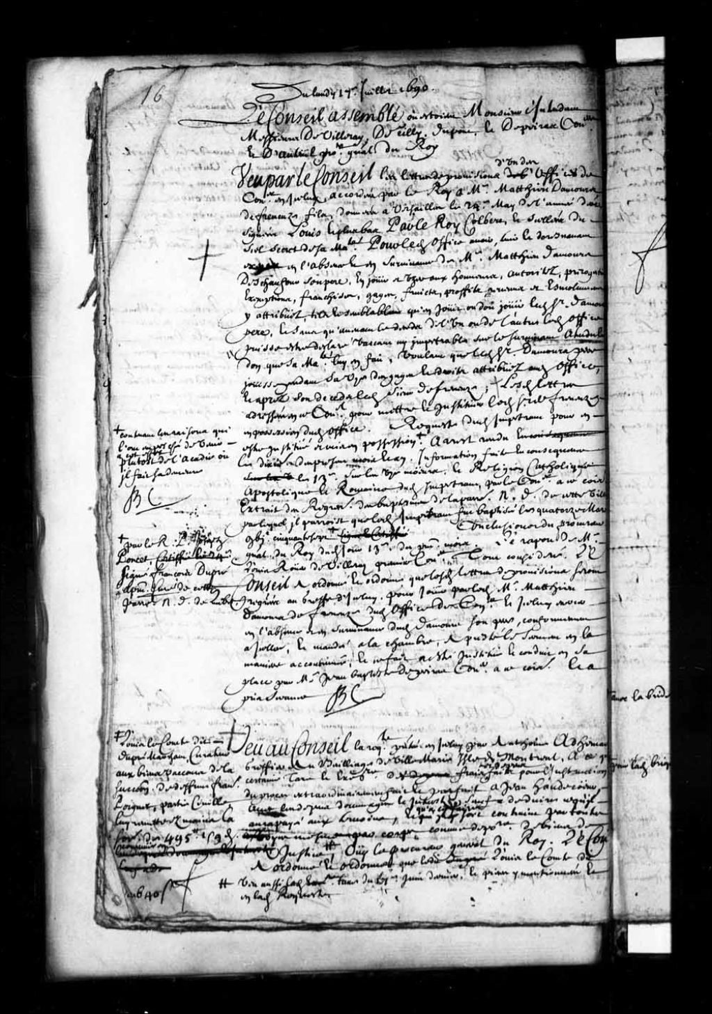 - Transcription du texte avec orthographe modernisée : «Du lundi 17e juillet 1690. Le Conseil assemblé où étaient Monsieur l'intendant Maîtres Louis Rouer de Villeray premier conseiller. Charles Legardeur de Tilly. Nicolas Dupont de Neuville. Et Jean-Baptiste Depeiras conseiller. Et François Madeleine Ruette d'Auteuil procureur général du Roi. Vu par le Conseil les lettres de provisions d'un des offices de conseiller en icelui, accordées par le Roi à maître Mathieu Damours defreneuse fils, données à Versailles le vingt-quatre mai de l'année dernière, signées Louis, et plus bas par le Roi Colbert, et scellées du sceau secret de sa Majesté pour ledit office avoir, tenir et dorénavant exercer en l'absence et en survivance de maître Mathieu Damours Deschaufour son père, en jouir et user aux honneurs, autorités, prérogatives, exemptions franchises, gages, fruits, profits, revenus et émoluments y attribués, tels et semblables qu'en jouit ou [...]