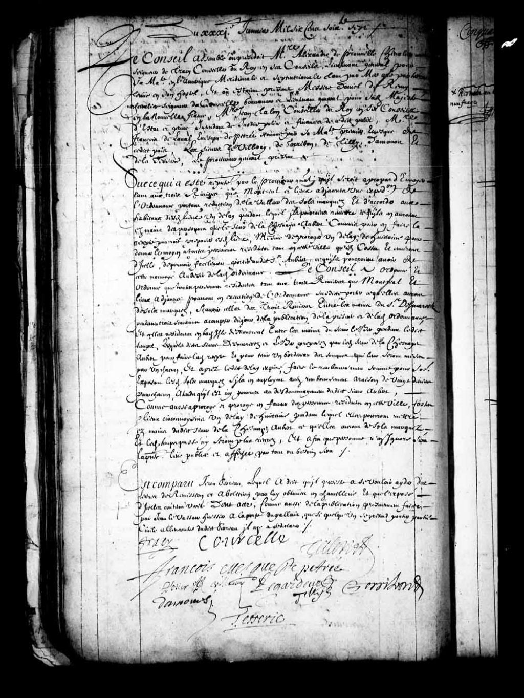 Comparution du sieur Jean Serreau, sieur de Saint-Aubin, informant le Conseil qu'il persiste à se prévaloir de ses lettres de rémission, 31 janvier 1667, Archives nationales à Québec, Fonds Conseil souverain, (03Q,TP1,S28,P447).