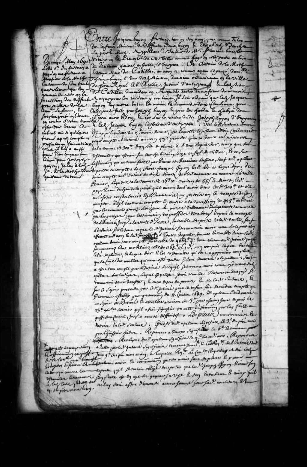 - Transcription du texte avec orthographe modernisée : «Entre Jacques GUYON FRESNAY tant en son nom que comme tuteur des enfants mineurs de défunts Denis Guyon et Elisabeth Boucher ses père et mère, appelant de sentence de maître François Genaple notaire en la prévôté de cette ville commis juge en cette partie au lieu du lieutenant général en icelle, d'une part. Et Antoine de LAMOTHE écuyer sieur de CADILLAC au nom et comme ayant épousé demoiselle Thérèse Guion l'une desdits mineurs demeurant ordinairement en la ville du Port-Royal à l'Acadie, intimé d'autre part, et ledit sieur CADILLAC demandeur en requête datée du neuvième de ce mois à ce que pour les causes y contenues il soit ordonné que ledit Jacques Guyon lui remettra entre les mains la somme de deux cents livres pour la dépense faite par Joseph Guyon, et pour les hardes et habits dont il peut avoir besoin, et ce sur le revenu dudit Joseph Guyon d'une part, et ledit Jacques GUYON [...]