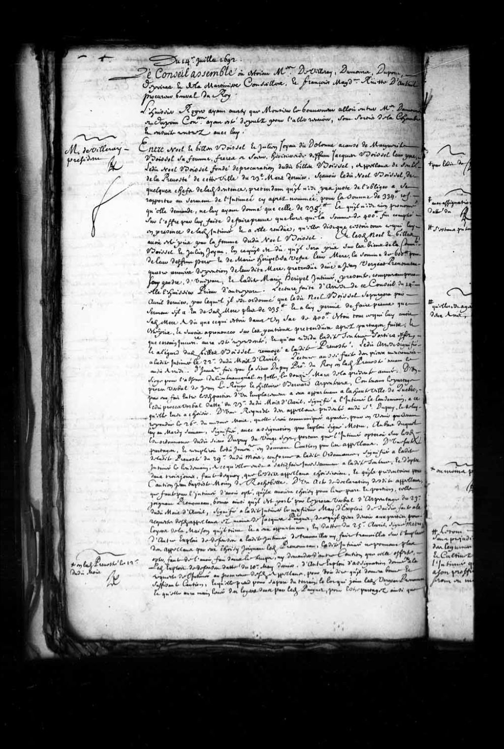 Transcription du texte avec orthographe modernisée : «Du quatorze juillet 1692. Le Conseil assemblé où étaient Maîtres Louis Rouer de Villeray premier conseiller. Mathieu Damours Deschaufour. Nicolas Dupont de Neuville. Jean-Baptiste Depeiras. Claude de Bermen, de la Martinière conseillers. Et François Madeleine Ruette d'Auteuil procureur général du Roi. L'huissier ROGER ayant averti que Monsieur le gouverneur allait entrer Messieurs Damours et Dupont conseillers ayant été députés pour l'aller recevoir, sont sortis de la chambre, et ensuite rentrés avec lui.»
