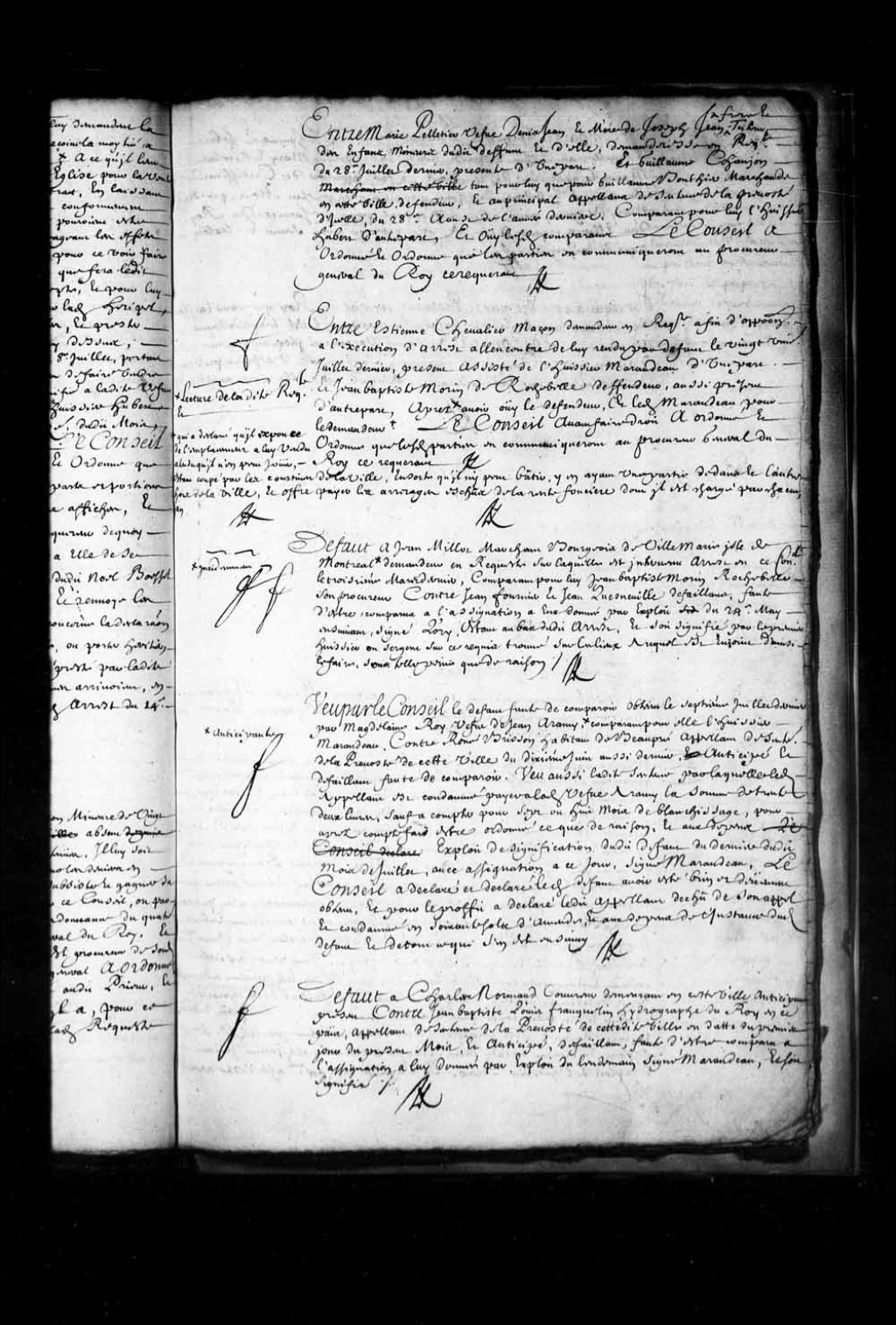 Transcription du texte avec orthographe modernisée : «Défaut à Jean Millot (Milot) marchand bourgeois de Ville-Marie île de Montréal incidemment demandeur en requête sur laquelle est intervenu arrêt en ce Conseil le troisième mars dernier, comparant pour lui Jean-Baptiste Morin Rochebelle son procureur, contre Jean Fournier et Jean Quesneville défaillant, faute d'être comparus à l'assignation à eux donnée par exploit du 24e mai ensuivant signé Lorry étant au bas dudit arrêt; et soit signifié par le premier huissier ou sergent sur ce requis trouvé sur les lieux auquel est enjoint d'ainsi le faire sous telle peine que de raison. ROUER DE VILLERAY.»