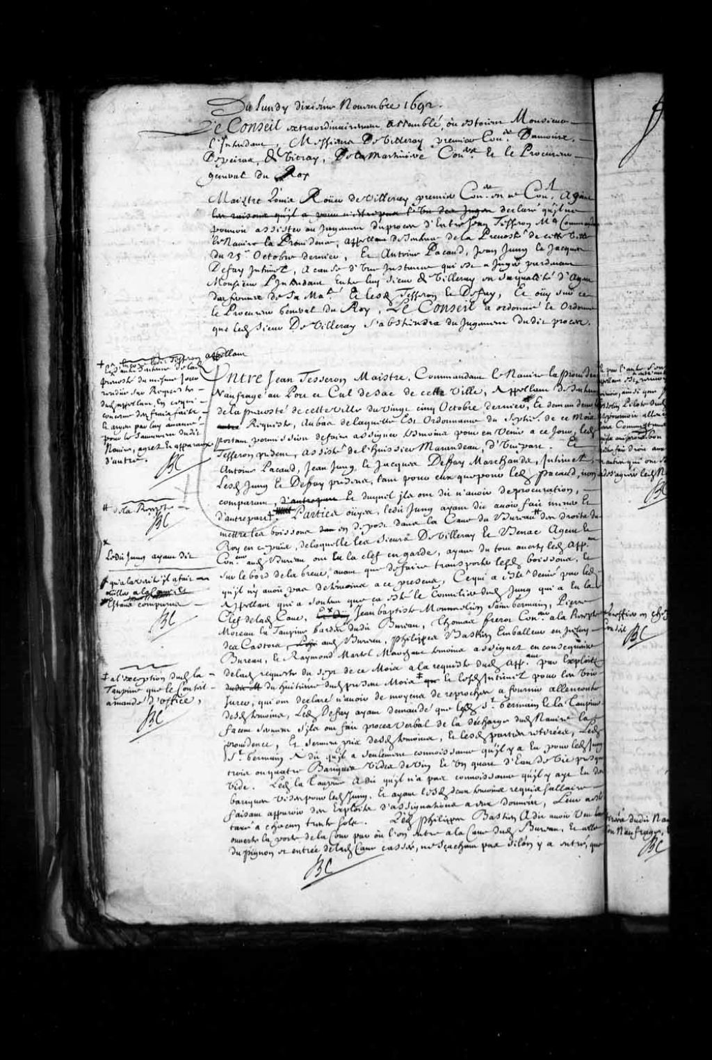 Arrêt ordonnant que Maître Louis Rouer de Villeray, premier conseiller, s'abstiendra de juger dans la cause de Jean Tesseron, Me commandant le navire «La Providence» contre Antoine Pacaud, Jean Jung et Jacques Faye, marchands, à cause d'une instance qui est juger par l'Intendant contre le dit de Villeray, agent des fermes de Sa Majesté et le dit Tesseron, 10 novembre 1692, Archives nationales à Québec, Fonds Conseil souverain, (03Q,TP1,S28,P4762).