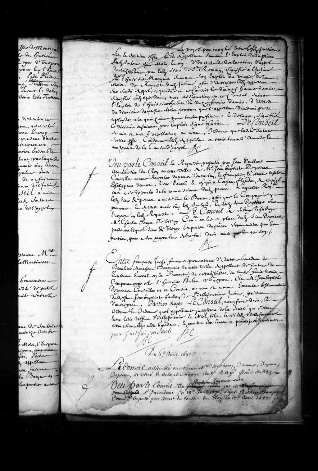Subrogation de maître Charles Denis de Vitré (Vitray) à maître Jean-Baptiste de Peiras comme conseiller rapporteur dans la cause de Jean Soulard, arquebusier du Roi, contre Françoise et Marie Ursule Philippeau, veuves de René Senard et Hugues Cochran dit Floridor, 16 mars 1693, Archives nationales à Québec, Fonds Conseil souverain, (03Q,TP1,S28,P4816).