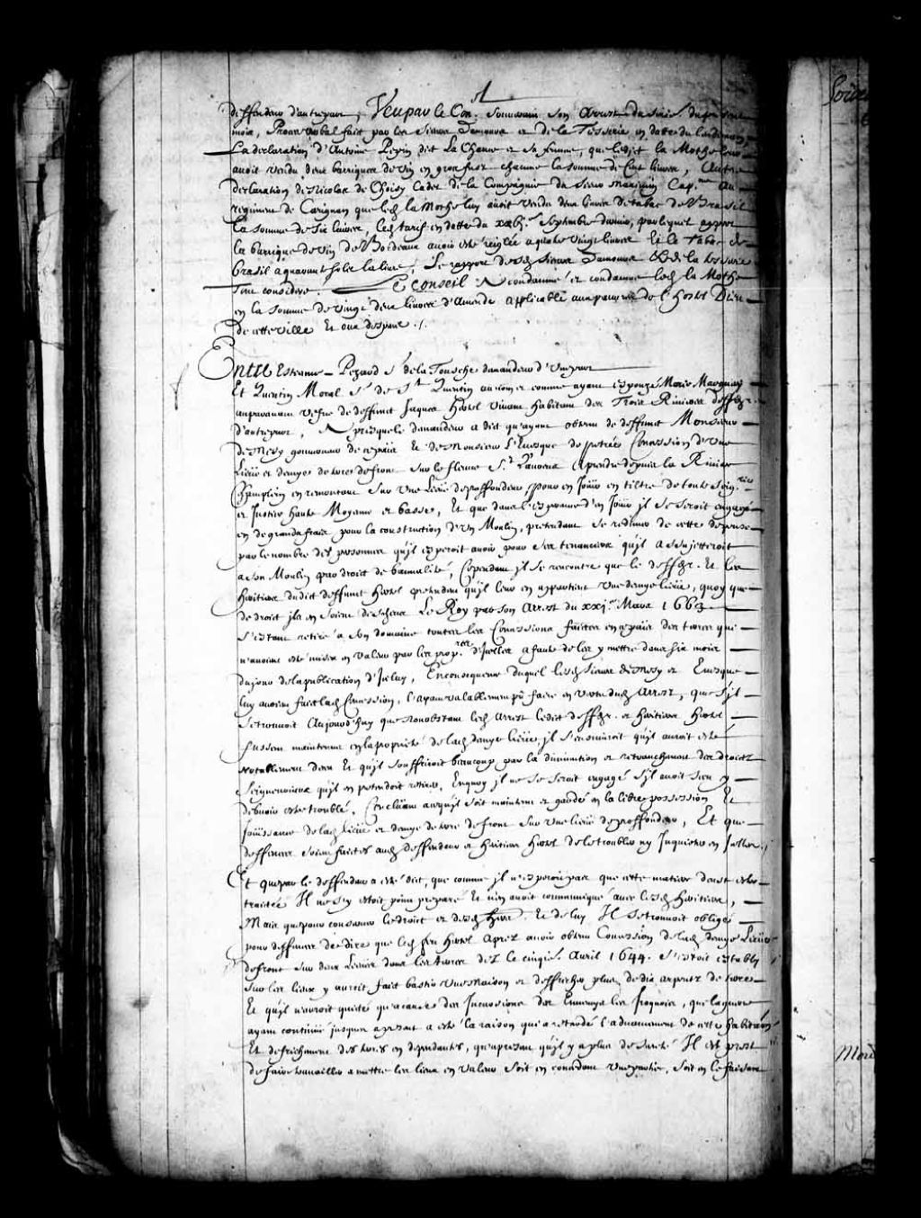 - Transcription du texte avec orthographe modernisée : «Entre Etienne PEZARD sieur de Latouche demandeur d'une part. Et Quentin Moral sieur de Saint-Quentin au nom et comme ayant épousé Marie Marguery auparavant veuve de défunt Jacques Hertel vivant habitant des Trois-Rivières défendeur d'autre part. Après que le demandeur a dit qu'ayant obtenu de défunt monsieur de Mesy gouverneur de ce pays et de Monsieur l'évêque de petrée concession d'une lieue et demie de terre de front sur le fleuve Saint-Laurent à prendre depuis la Rivière Champlain en remontant sur une lieue de profondeur pour en jouir en titre de toute seigneurie et justice haute moyenne et basse, et que dans l'espérance d'en jouir il se serait engagé en de grands frais pour la construction d'un moulin prétendant se rédimer de cette dépense par le nombre des personnes qu'il espérait avoir pour ses tenanciers qu'il assujettirait à son moulin par droit de banalité, cependant il se [...]