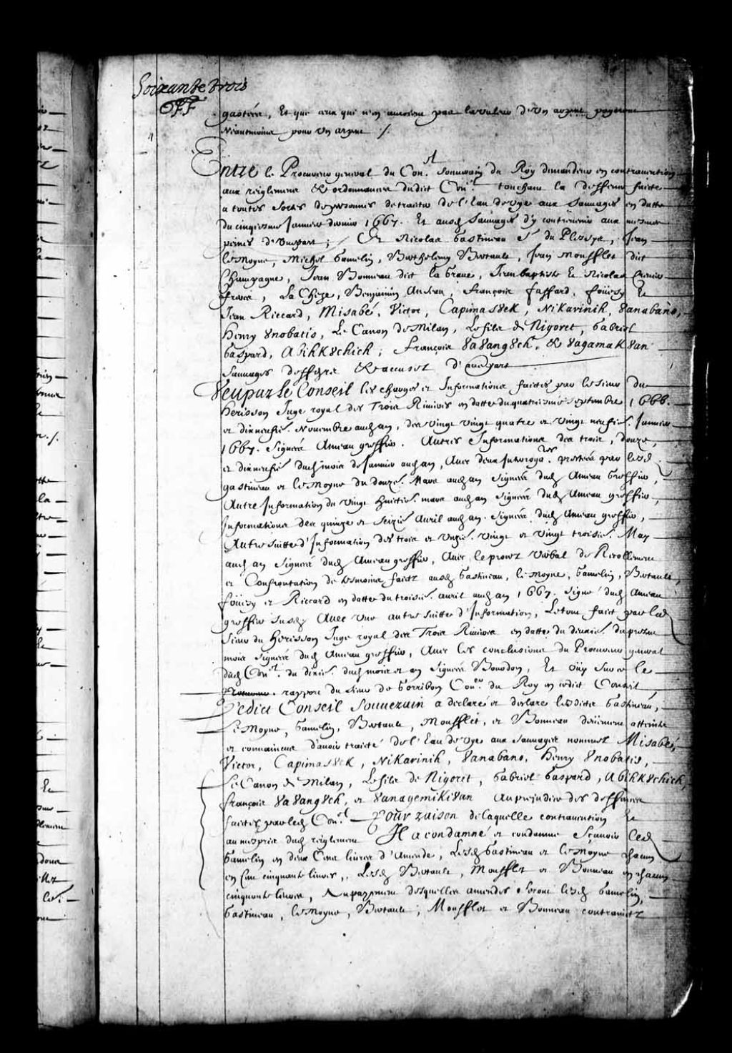 Transcription du texte avec orthographe modernisée : «Entre le procureur général du Conseil souverain du Roi demandeur en contravention aux règlements et ordonnances dudit Conseil touchant la défense faite à toutes sortes de personnes de traiter de l'eau-de-vie aux Sauvages en date du cinquième janvier dernier 1667. Et auxdits Sauvages d'y contrevenir aux mêmes peines d'une part; et Nicolas Gastineau sieur duPlessys, Jean Lemoyne, Michel Gamelin, Barthélemy Bertault, Jean Moufflet dit Champagne, Jean Bonneau dit LaGrave, Jean-Baptiste et Nicolas Crevier frères, Lachaise, Benjamin Anseau, François Faffard, Fouesy et Jean Riccard, Misabé, Victor, Capimasouck, Nikarinih, Ouanabano, Henri Ounobatis, Le Carron (Caron) de Milan, le fils de Nigoret, Gabriel Gaspard, Abihkouchich, François Ouaouangouch, et Ouagamakouan sauvages défendeurs et accusés d'autre part vu par le Conseil les charges et informations faites par le sieur du Herisson juge [...]
