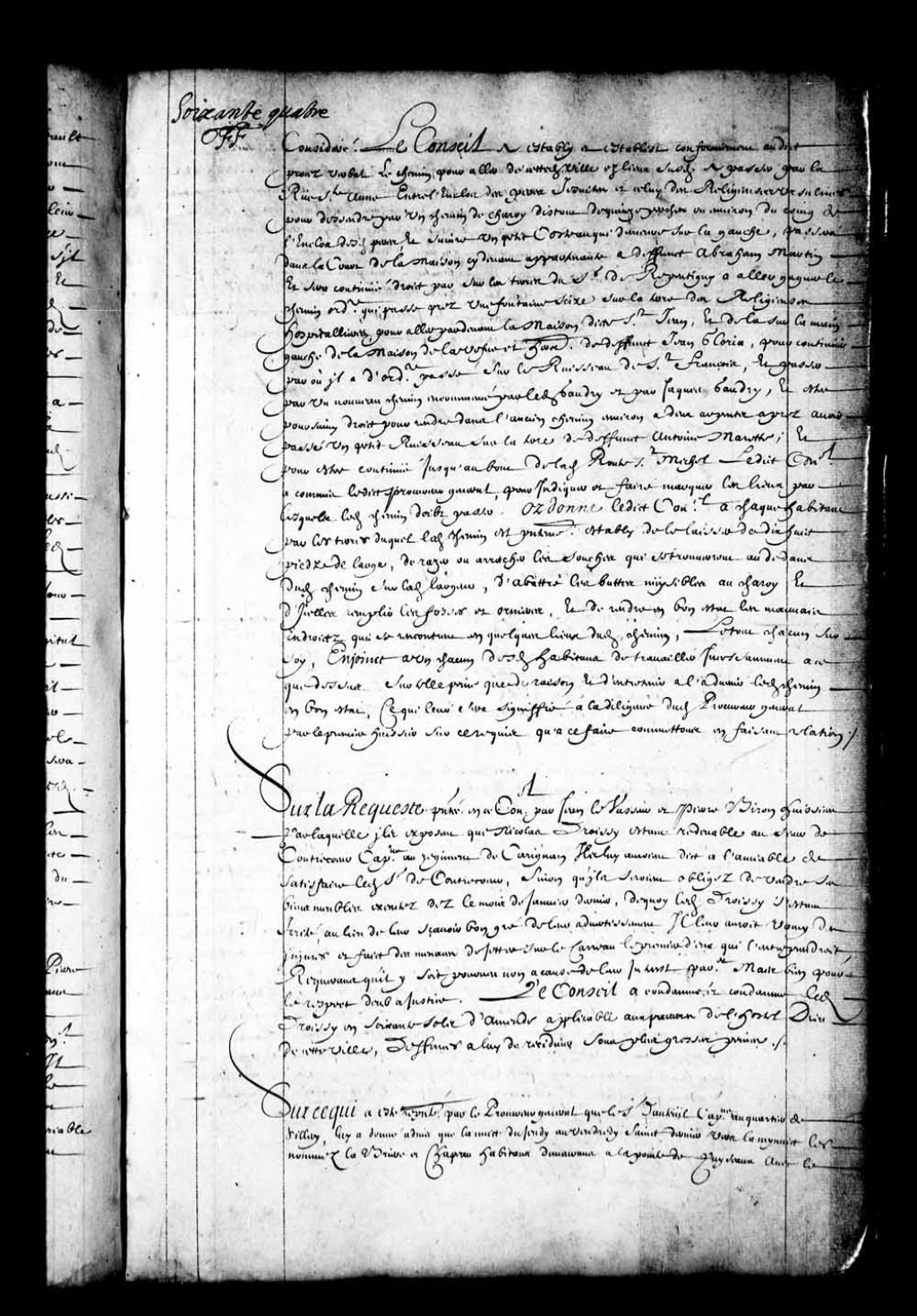 Transcription du texte avec orthographe modernisée : «Sur ce qui a été représenté par le procureur général que le sieur d'Auteuil capitaine au quartier de Sillery, lui a donné avis que la nuit du jeudi au vendredi saint dernier vers la minuit les nommés Labrière et Chapeau habitant demeurant à la Pointe de Puyseaux avec le valet dudit Labrière lui amenèrent trois jeunes hommes qu'ils avaient pris saisis d'eau-de-vie proche les cabanes des Sauvages et qu'un desdits jeunes hommes qui se dit cadet de la maison de Bassigny et volontaire en la compagnie du sieur de LaVarenne parlementait avec un Sauvage qui lui prit et enleva son épée, ne sachant lesdits Labrière et Chapeau le pourquoi, que ledit Cadet avoua ensuite qu'il était véritable que lui et un des autres matelot étaient allés exprès pour traiter un baril d'environ deux pots et une bouteille remplie d'eau-de-vie avec les Sauvages, et que l'autre n'était point de leur complot, et que [...]