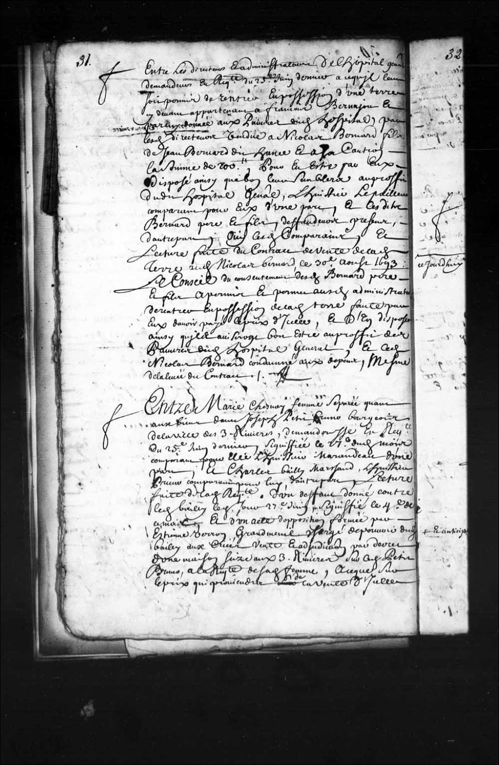 - Transcription du texte avec orthographe modernisée : «Entre les directeurs et administrateurs l'hôpital général demandeur en requête du vingt-cinquième juin dernier à ce qu'il leur soit permis de rentrer en possession d'une terre ci-devant appartenant à François Bernajou et par lui donnée aux pauvres du hôpital par lesdits directeurs rendue à Nicolas Bernard fils de Jean Bernard dit Ance et à sa caution la somme de deux cents livres pour être par eux disposé ainsi que bon leur semblera au profit dudit hôpital général, l'huissier Lepailleur comparant pour eux d'une part, et lesdits BERNARD père et fils, défendeurs présents d'autre part, ouï lesdits comparants et lecture faite du contrat de rente de ladite terre, audit Nicolas Bernard le trentième août 1693. Le Conseil du consentement desdits Bernard père et fils a permis et permet auxdits administrateurs de rentrer en possession de ladite terre faute par eux d'avoir payé le prix d'icelle et d'en disposer ainsi qu'il aviseront bon être au profit des pauvres dudit hôpital général et ledit Nicolas Bernard condamné aux dépens même de la levée du contrat. ROUER DE VILLERAY.»