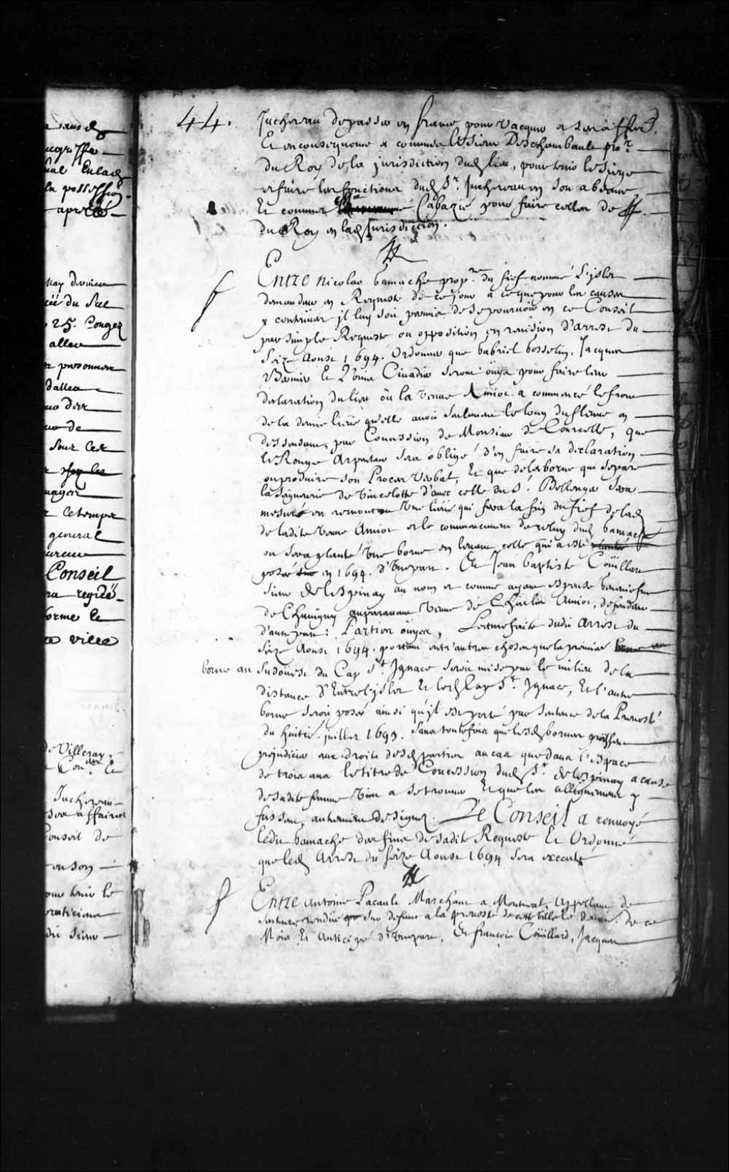 - Transcription du texte avec orthographe modernisée : «Entre Nicolas GAMACHE propriétaire du fief nommé L'Islet, demandeur en requête de ce jour, à ce que pour les causes y contenues il lui soit permis de se pourvoir en ce Conseil par simple requête ou opposition en révision d'arrêt du seizième octobre 1694. Ordonner que Gabriel Gosselin, Jacques Bernier et Louis Civadier seront ouïs pour faire leur déclaration du lieu où la veuve Amiot a commencé le front de la demie lieue qu'elle avait seulement le long du fleuve en descendant, par concession de Monsieur de Courcelle que LeRouge arpenteur sera obligé d'en faire sa déclaration ou produira son procès-verbal et que de la borne qui sépare la seigneurie de Vincellotte (Vincelotte); d'avec celle du sieur Bellanger (Bélanger) sera mesuré en remontant une lieue qui fera la fin du fief de ladite veuve Amiot, et le commencement de celui dudit Gamache ou sera planté une borne en levant celle qui a été posée en 1694. D'une part, et Jean-Baptiste COUILLARD sieur de LEPINAY (Lespinay) au nom et comme ayant épousé Geneviève de Chavigny auparavant veuve de Charles Amiot défendeur d'autre part. Parties ouïes, lecture faite dudit arrêt du seize août 1694 portant entre autres choses que la première borne au sud-ouest du cap Saint-Ignace serait mise par le milieu de la distance entre L'Islet et ledit Cap Saint-Ignace et l'autre borne serait posée ainsi qu'il est porté par sentence de la prévôté du huit juillet 1693. sans toutefois que lesdites bornes pussent préjudicier aux droits desdites parties au cas que dans l'espace de trois ans le titre de concession dudit sieur de L'Epinay (Lespinay) à cause de sa dite femme vint à se trouver et que les alignements y fussent autrement désignés. Le Conseil a renvoyé ledit Gamache des fins de sa dite requête, et ordonné que ledit arrêt du seize août 1694. sera exécuté. ROUER DE VILLERAY.»