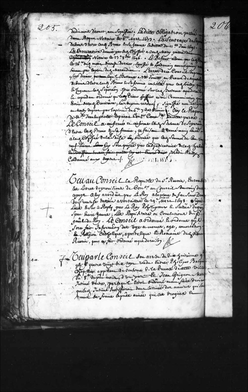 Transcription du texte avec orthographe modernisée : «Vu au Conseil la requête du sieur Riverin, ensemble les lettres des provisions de conseiller au Conseil souverain de ce pays à lui accordées par le Roi à la place du feu sieur Damours de Freneuse, datées à Versailles le vingt-quatrième mars mille six cent quatre-vingt-dix-huit, signées Louis et sur le repli par le Roi Phelipeaux et scellées du grand sceau en cire jaune. les réquisitoire ou conclusions du procureur général du Roi, le Conseil a ordonné et ordonne qu'il sera fait information des vie et moeurs, âge compétent, conversation et religion catholique, apostolique et romaine dudit sieur Riverin, pour ce fait être ordonné ce que de raison. BOCHART CHAMPIGNY.»