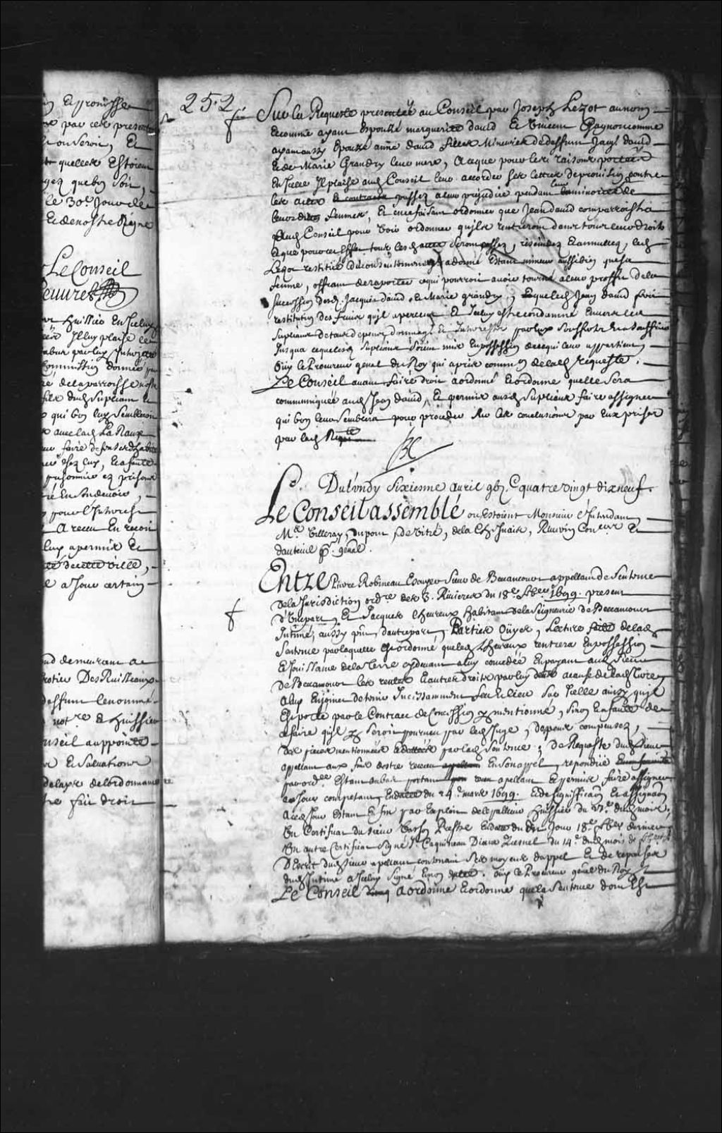 - Transcription du texte avec orthographe modernisée : «Du lundi sixième avril mille six cent quatre-vingt-dix-neuf. Le Conseil assemblé où étaient Monsieur l'intendant, maîtres Louis Rouer de Villeray premier conseiller, Nicolas Dupont de Neuville, Charles Denys de Vitray, Charles Aubert de Lachesnais, Denis Riverin conseiller et François Madeleine Ruette d'Auteuil procureur général du Roi. Entre Pierre ROBINEAU écuyer sieur de BECCANCOURT (Bécancour) appelant de sentence de la juridiction ordinaire des Trois-Rivières du 18e février 1699 présent d'une part, et Jacques l'HEUREUX, habitant de la seigneurie de Beccancourt, intimé aussi présent d'autre part. Parties ouïes, lecture faite de ladite sentence par laquelle est ordonné que ledit L'heureux (Lereau, Levreau) rentrera en possession et jouissance de la terre ci-devant à lui concédée en payant audit sieur de Beccancourt les rentes et autres droits par lui dû à cause de ladite terre, à [...]