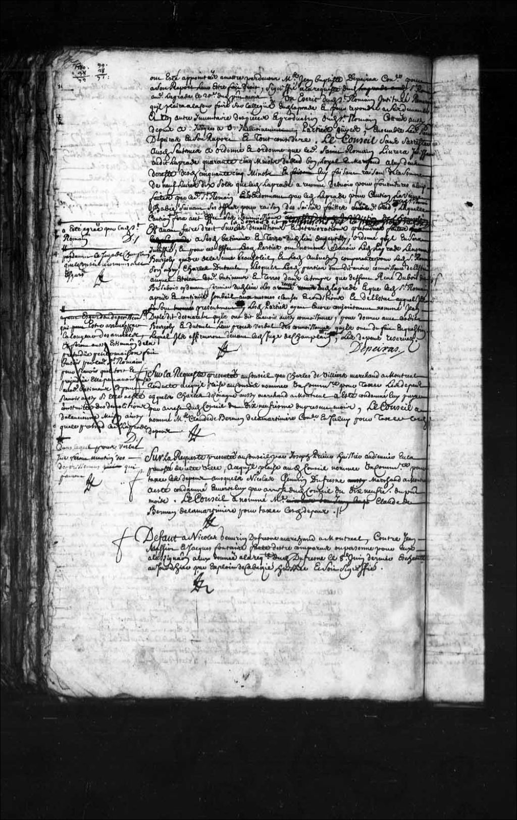 Nomination de maître Claude de Bermen de la Martinière, conseiller, pour taxer les dépens auxquels Nicolas Janvrin Dufresne, marchand à Montréal a été condamné payer à Joseph Prieur, huissier audiencier de la Prévôté de Québec, 27 juillet 1700, Archives nationales à Québec, Fonds Conseil souverain, (03Q,TP1,S28,P5495).