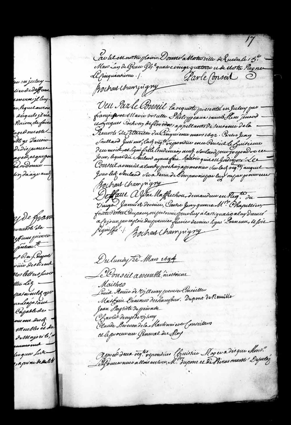 Transcription du texte avec orthographe modernisée : «Vu par le Conseil la requête présentée en icelui que Françoise et Marie Ursule Phelippeaux veuve René Senard et Hugues Cochran de Floridor, appelants de sentence de la prévôté de cette ville du cinquième mars 1692, contre Jean Soullard intimé, ladite requête répondue en ce Conseil le huitième de ce mois, et signifiée le lendemain audit Soulard, pour y répondre ce jour, lequeldit Soulard ayant fait savoir qu'il est indisposé: le Conseil a remis à lundi prochain à prononcer sur ladite requête, auquel jour ledit Soulard sera tenu de comparaître par lui ou par procureur. BOCHART CHAMPIGNY.»