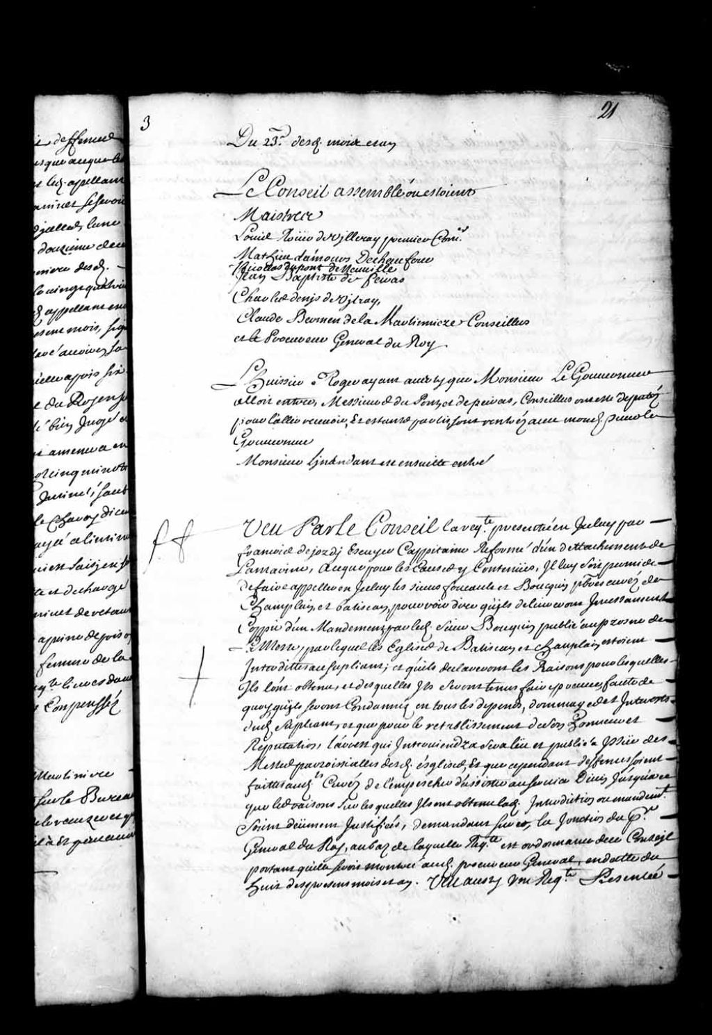 - Transcription du texte avec orthographe modernisée : «Vu par le Conseil la requête présentée en icelui par François Dejordy écuyer capitaine reformé d'un détachement de la marine, à ce que pour les causes y contenues, il lui soit permis de faire appeler en icelui les sieurs Foucault et Bouquin prêtres curés de Champlain, et Batiscan pour voir dire qu'ils délivreront incessamment copie d'un mandement, par ledit sieur Bouquin publié au prône de la messe, par lequel les églises de Batiscan et Champlain étaient interdites au suppliant; et qu'ils déclareront les raisons pour lesquelles ils l'ont obtenu, et desquelles ils seront tenus faire preuve, faute de quoi, qu'ils seront condamnés en tous les dépens, dommages et intérêts dudit suppliant, et que pour le rétablissement de son honneur et réputation, l'arrêt qui interviendra sera lu et publié a issue des messes paroissiales desdites églises. Et que cependant défenses soient faites auxdits [...]