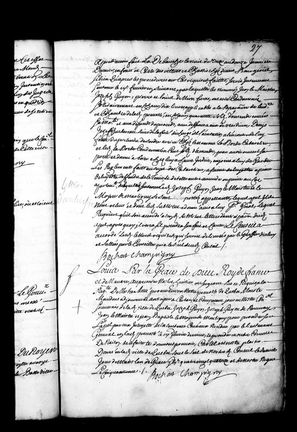 Transcription du texte avec orthographe modernisée : «Louis par la grâce de Dieu Roi de France et de Navarre, au premier notre huissier ou sergent sur ce requis, à la requête de notre aimé procureur en notre prévôté de Québec, nous te mandons ajourner et anticiper à certain et compétent jour en notre Conseil souverain de ladite ville de Québec, Joseph Guyon, Joseph Guyon de Rouvray, Jean Lemaistre et Jean-Baptiste Lemoyne de Martigny pour procéder sur l'appel par eux interjeté de la sentence contre eux rendue par le lieutenant général en ladite prévôté le 17e février dernier, et procéder en outre comme de raison, de ce faire te donnons pouvoir, car tel est notre plaisir. Donné en ladite ville de Québec sous le sceau de notre dit Conseil le dernier jour de mars l'an de grâce mille six cent quatre-vingt-quatorze et de notre règne le cinquantième. BOCHART CHAMPIGNY.»