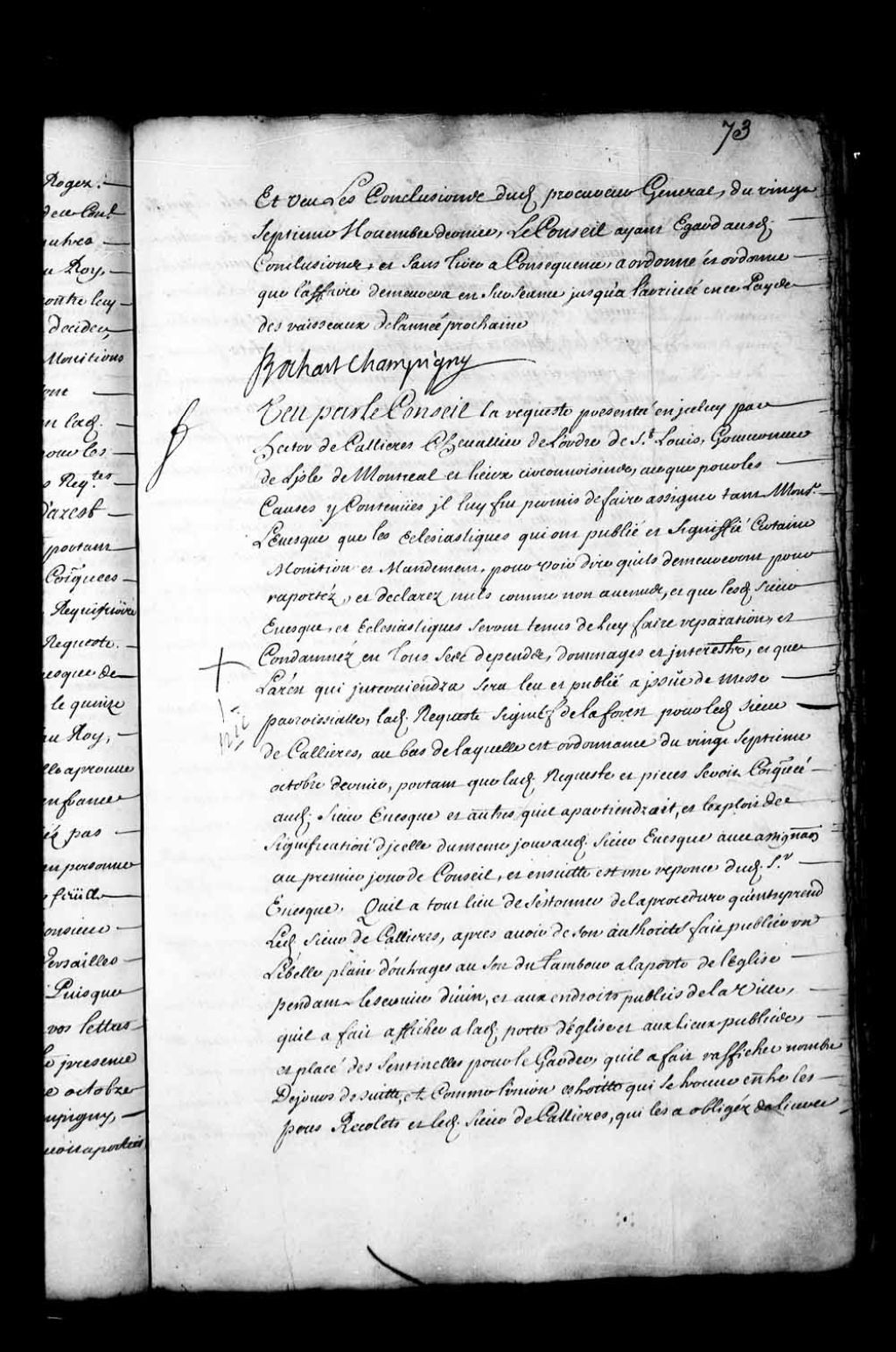 - Transcription du texte avec orthographe modernisée : «Vu par le Conseil la requête présentée en icelui par Hector de Callières chevalier de l'ordre de Saint-Louis, gouverneur de l'île de Montréal et lieux circonvoisins, à ce que pour les causes y contenues il lui fut permis de faire assigner tant Monsieur l'évêque que les ecclésiastiques qui ont publié et signifié certaine monition et mandement, pour voir dire qu'ils demeureront pour rapportés et déclarés nuls comme non avenus, et que lesdits sieur évêque et ecclésiastiques seront tenus de lui faire réparation, et condamnés en tous ses dépens, dommages et intérêts, et que l'arrêt qui interviendra sera lu et publié a issue de messe paroissiale, ladite requête signée F. de Laforest pour ledit sieur de Callières au bas de laquelle est ordonnance du vingt-septième octobre dernier, portant que ladite requête et pièces serait communiquée audit sieur évêque et autres qu'il appartiendrait, et l [...]