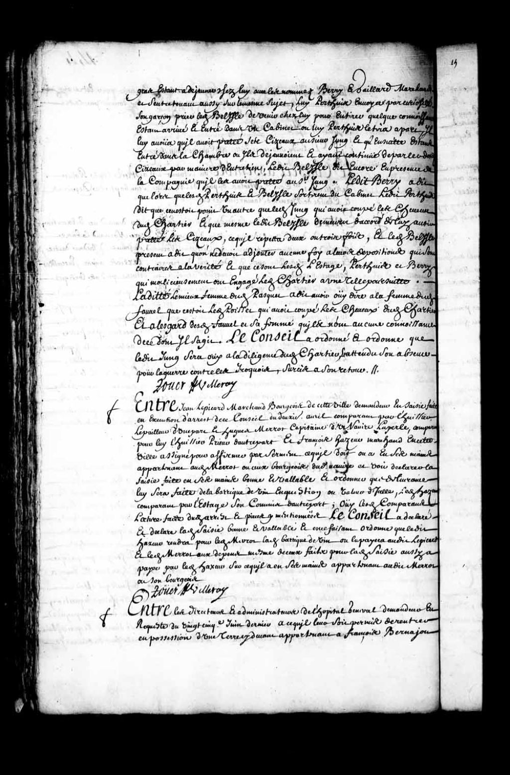 Transcription du texte avec orthographe modernisée : «Entre les directeurs et administrateurs l'hôpital général demandeur en requête du vingt-cinquième juin dernier à ce qu'il leur soit permis de rentrer en possession d'une terre ci-devant appartenant à François Bernajou et par lui donnée aux pauvres du hôpital par lesdits directeurs rendue à Nicolas Bernard fils de Jean Bernard dit Ance et à sa caution la somme de deux cents livres pour être par eux disposé ainsi que bon leur semblera au profit dudit hôpital général, l'huissier Lepailleur comparant pour eux d'une part, et lesdits BERNARD père et fils, défendeurs présents d'autre part, ouï lesdits comparants et lecture faite du contrat de rente de ladite terre, audit Nicolas Bernard le trentième août 1693. Le Conseil du consentement desdits Bernard père et fils a permis et permet auxdits administrateurs de rentrer en possession de ladite terre faute par eux d'avoir payé le prix d'icelle et d'en disposer ainsi qu'il aviseront bon être au profit des pauvres dudit hôpital général et ledit Nicolas Bernard condamné aux dépens même de la levée du contrat. ROUER DE VILLERAY.»
