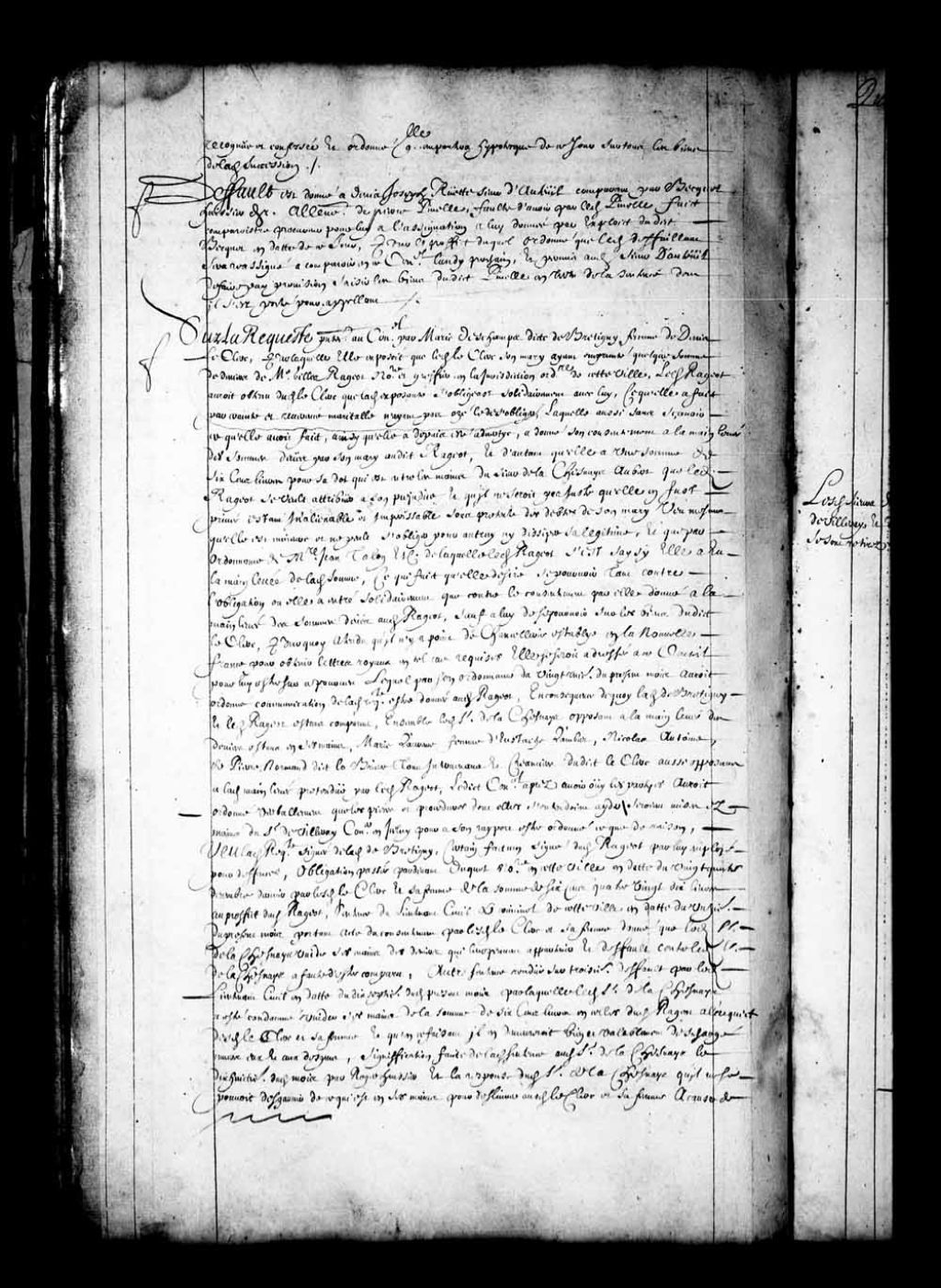 Transcription du texte avec orthographe modernisée : «Défaut est donné à Denis Joseph Ruette sieur d'Auteuil comparant par Becquet huissier, demandeur à l'encontre de Pierre Pinelle, faute d'avoir par ledit Pinelle fait comparaître procureur pour lui à l'assignation à lui donnée par exploit dudit Becquet en date de ce jour; pour le profit duquel ordonné que ledit défaillant sera réassigné à comparaître en ce Conseil lundi prochain, et permis audit sieur d'Auteuil de faire par provision saisir les biens dudit Pinelle en vertu de la sentence dont il s'est porté pour appelant.»