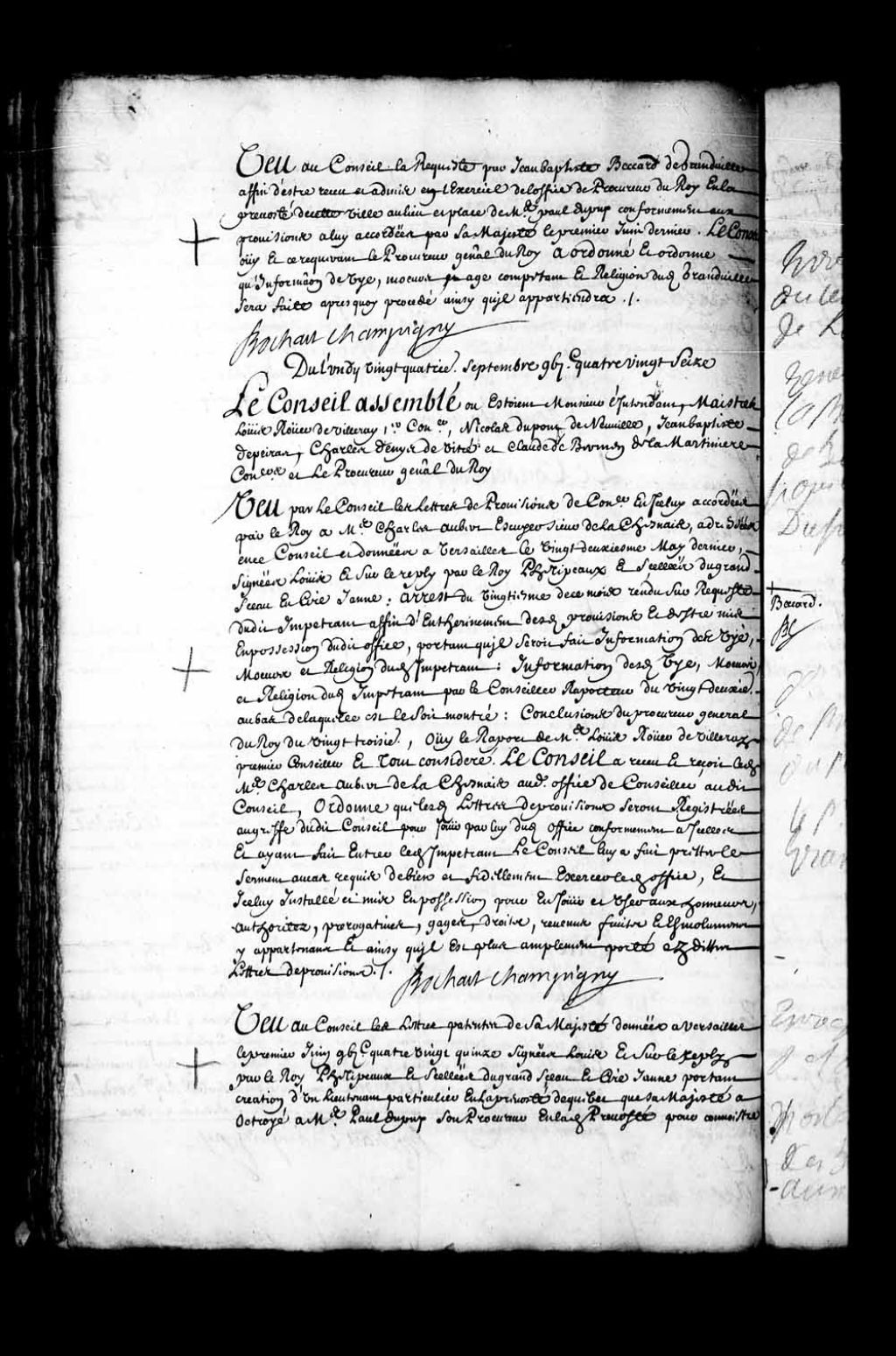 Transcription du texte avec orthographe modernisée : «Vu au Conseil la requête par Jean-Baptiste Beccard de Grandeville afin d'être reçu et admis en l'exercice de l'office de procureur du Roi en la prévôté de cette ville au lieu et place de maître Paul Dupuy conformément aux provisions à lui accordées par sa Majesté le premier juin dernier. Le Conseil ouï et ce requérant le procureur général du Roi a ordonné et ordonne qu'information de vie, moeurs, et âge compétent et religion dudit Grandeville sera faite après quoi procédé ainsi qu'il appartiendra. BOCHART CHAMPIGNY.»