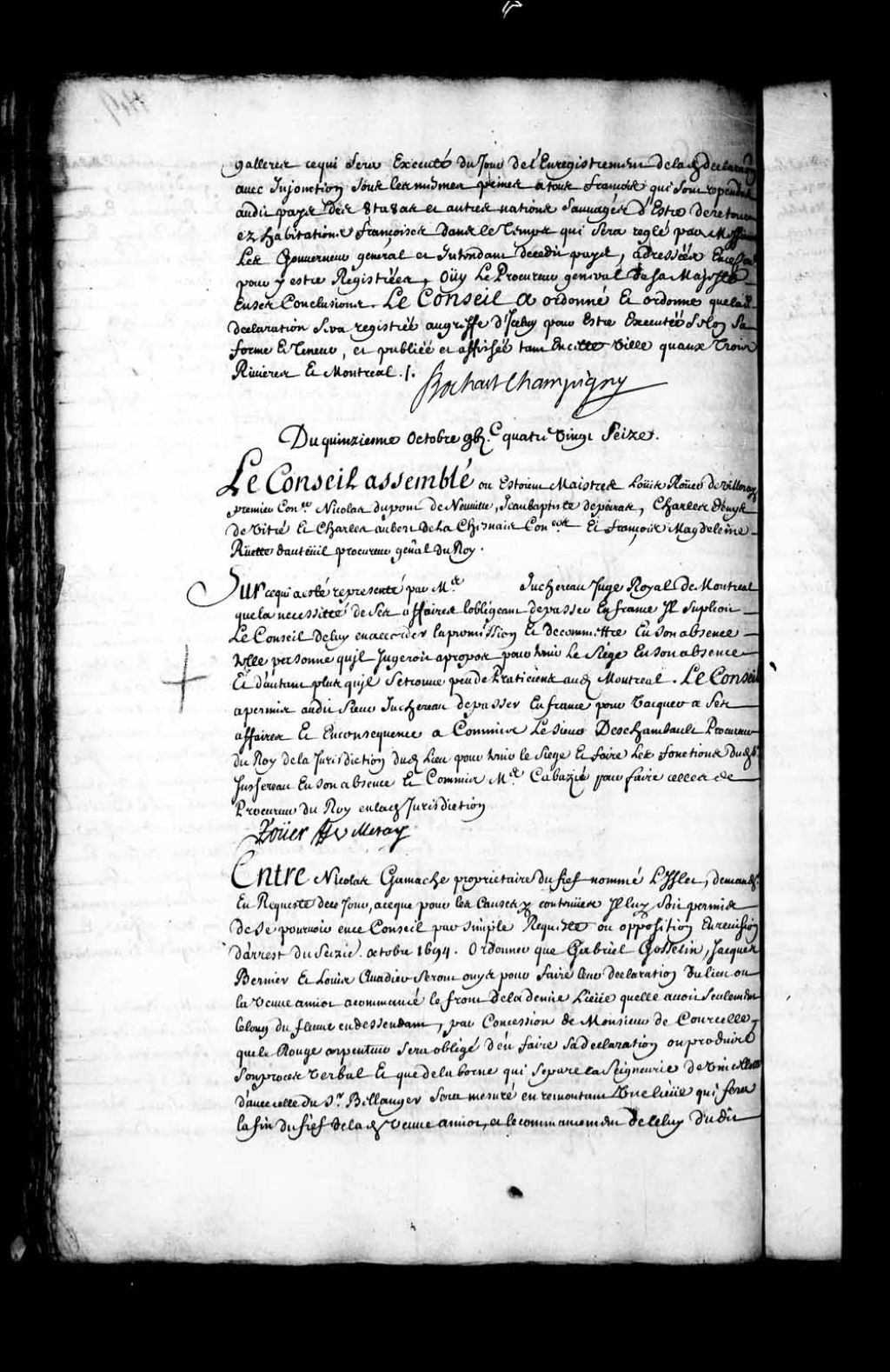 - Transcription du texte avec orthographe modernisée : «Entre Nicolas GAMACHE propriétaire du fief nommé L'Islet, demandeur en requête de ce jour, à ce que pour les causes y contenues il lui soit permis de se pourvoir en ce Conseil par simple requête ou opposition en révision d'arrêt du seizième octobre 1694. Ordonner que Gabriel Gosselin, Jacques Bernier et Louis Civadier seront ouïs pour faire leur déclaration du lieu où la veuve Amiot a commencé le front de la demie lieue qu'elle avait seulement le long du fleuve en descendant, par concession de Monsieur de Courcelle que LeRouge arpenteur sera obligé d'en faire sa déclaration ou produira son procès-verbal et que de la borne qui sépare la seigneurie de Vincellotte (Vincelotte); d'avec celle du sieur Bellanger (Bélanger) sera mesuré en remontant une lieue qui fera la fin du fief de ladite veuve Amiot, et le commencement de celui dudit Gamache ou sera planté une borne en levant celle qui a été posée en 1694. D'une part, et Jean-Baptiste COUILLARD sieur de LEPINAY (Lespinay) au nom et comme ayant épousé Geneviève de Chavigny auparavant veuve de Charles Amiot défendeur d'autre part. Parties ouïes, lecture faite dudit arrêt du seize août 1694 portant entre autres choses que la première borne au sud-ouest du cap Saint-Ignace serait mise par le milieu de la distance entre L'Islet et ledit Cap Saint-Ignace et l'autre borne serait posée ainsi qu'il est porté par sentence de la prévôté du huit juillet 1693. sans toutefois que lesdites bornes pussent préjudicier aux droits desdites parties au cas que dans l'espace de trois ans le titre de concession dudit sieur de L'Epinay (Lespinay) à cause de sa dite femme vint à se trouver et que les alignements y fussent autrement désignés. Le Conseil a renvoyé ledit Gamache des fins de sa dite requête, et ordonné que ledit arrêt du seize août 1694. sera exécuté. ROUER DE VILLERAY.»
