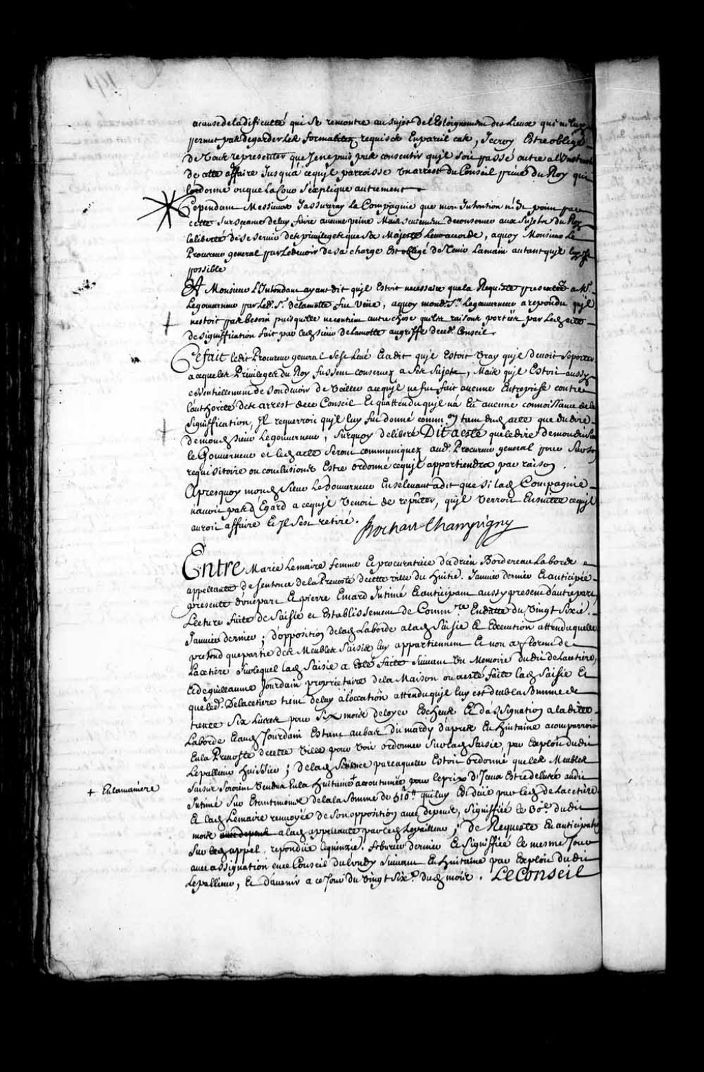 Transcription du texte avec orthographe modernisée : «Entre Marie LEMAIRE femme et procuratrice de Adrien Bordereau Laborde appelante de sentence de la prévôté de cette ville du huitième janvier dernier et anticipée présente d'une part et Pierre EMARD intimé et anticipant aussi présent d'autre part, lecture faite de saisie et établissement de commissaire en date du vingt-sixième janvier dernier; d'opposition de ladite Laborde à ladite saisie et exécution attendu qu'elle prétend que partie des meubles saisis lui appartiennent et non à Florent de Lacetière sur lequel ladite saisie a été faite suivant un mémoire dudit de Lacetière, et de Guillaume Jourdain propriétaire de la maison ou a été faite ladite saisie et que ledit de Lacetière tient de lui à location attendu qu'il lui est dû la somme de trente-six livres pour six mois de loyer échus et d'assignation à ladite Laborde et audit Jourdain étant au bas du mardi d'après en huitaine à comparoir en la prévôté de cette ville pour voir ordonner sur ladite saisie, par exploit dudit Lepallieur huissier; de ladite sentence par laquelle était ordonné que les meubles saisis seraient vendus en la huitaine en la manière accoutumée pour le prix d'iceux être délivré audit intimé sur étant moins de la somme de 510 livres qui lui est due par ledit de Lacetière et ladite Lemaire renvoyée de son opposition avec dépens, signifiée le 30e dudit mois à ladite appelante par ledit Lepailleur; de requête en anticipation sur ledit appel répondue le quinzième février dernier et signifiée le même jour avec assignation en ce Conseil du lundi suivant en huitaine par exploit dudit Lepallieur, et d'avenir à ce jour du vingt-sixième dudit mois. Le Conseil a ordonné et ordonne avant faire droit que ladite appelante justifiera par témoins qu'elle a prêtée audit de Lacetière la somme de trente-deux livres savoir vingt livres pour payer la façon du coffre et six chaises saisis et douze livres pour acheter le bois de noyer dont Ils sont faits, et au cas qu'elle puisse faire cette justification ladite somme lui sera rendue par privilège sur les deniers qui proviendront de la vente desdits coffre et chaises; comme aussi qu'elle justifiera ainsi qu'elle a offert qu'elle a acheté les trois plats et quatre assiettes aussi saisis à l'encan du sieur LeVasseur ingénieur, et qu'elle affirmera par serment si ladite vaisselle et Tourtière par elle réclamés n'ont été que prêtés et non vendus audit de Lacetière, et si elle n'en a point été payée, pour ce fait être ordonné ce qu'il appartiendra. BOCHART CHAMPIGNY.»