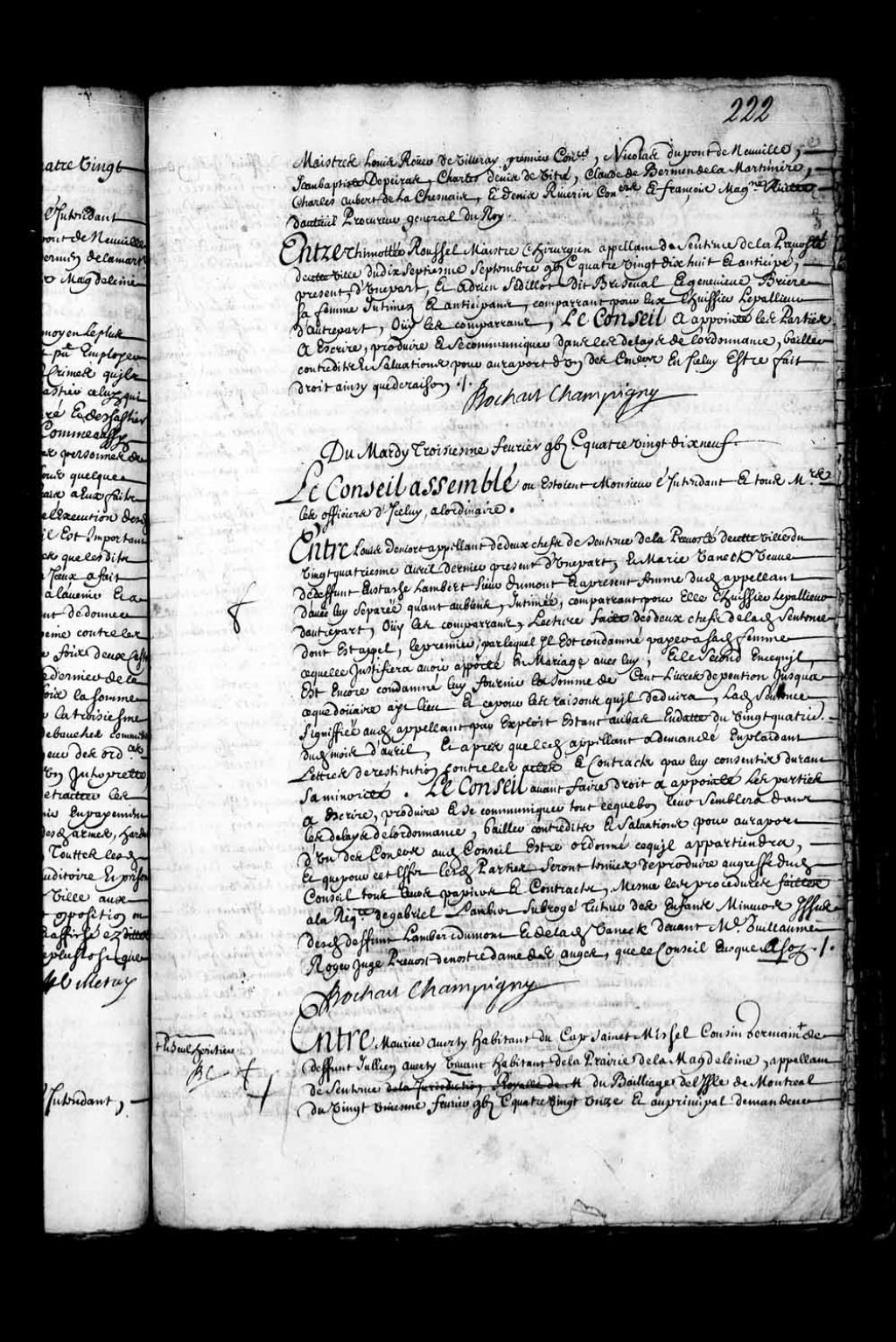 - Transcription du texte avec orthographe modernisée : «Entre Maurice Averty habitant du Cap Saint-Michel cousin germain et seul héritier de défunt Julien Averti vivant habitant de la Prairie de la Madeleine, appelant de sentence du bailliage de l'île de Montréal du vingt et unième février mille six cent quatre-vingt-onze et au principal demandeur à ce que certaine donation faite entre vifs par ledit défunt Julien Averti de ses biens meubles et immeubles à Jean Caillaud dit Baron et Marie Touchard sa femme habitant de la Prairie de la Madeleine, passée par-devant Adhémart notaire audit Montréal le quinzième décembre mille six cent quatre-vingt-sept soit cassée et annulée, l'insinuation n'en ayant été faite qu'audit bailliage de Montréal et non à la juridiction royale des Trois-Rivières dans le ressort de laquelle sont sis et situés les biens de la succession dudit défunt Julien Averti, ledit appelant présent assisté de Florent de LaCetière d'une part, et Jean CAILLAUD dit Baron et Marie TOUCHARD sa femme intimés et au principal défendeurs, comparant pour eux l'huissier Lepallieur, fondé de procuration d'autre part, lecture faite de ladite sentence par laquelle ledit appelant était débouté des fins et conclusions par lui prises et ladite donation déclarée bonne et valablement insinuée au désir des ordonnances, et ordonne qu'elle sortirait son plein et entier effet, avec défenses audit appelant et à tous autres de troubler ni inquiéter lesdits Caillaud et sa femme. Et icelui appelant condamné aux dépens taxés à la somme de quarante-quatre livres deux sols quatre deniers, ladite sentence signifiée audit appelant par exploit étant au bas du vingt-septième ensuivant. Des pièces mentionnées et datées par ladite sentence ci-dessus datée; d'acte d'appel de ladite sentence du neuvième mars de ladite année, signifié le douzième dudit mois; de requête dudit appelant adressée en ce Conseil aux fins d'entre reçu en sondit appel, répondue le septième avril ensuivant et signifiée à partie le vingt-troisième dudit mois par exploit de Petit huissier portant assignation en ce Conseil au onzième juin d'après pour procéder sur ledit appel; d'acte d'affirmation faite par ledit Maurice Averti de son arrivée en cette ville pour relever sondit appel et protestation de répéter contre ledit intimé les frais de son voyage, séjour et retour en date du septième dudit mois avril, signifié à partie le vingt-troisième dudit mois; de griefs d'appel, signifiés à partie le 17e décembre de ladite année 1691; de défaut au profit dudit Averti contre ledit Baron en date du 25e juin de ladite année signifié le 3e jour d'août ensuivant avec assignation en ce Conseil au vingt-quatre septembre par exploit dudit Petit; d'arrêt de ce Conseil portant que ledit intimé plaidrait au fonds, en date du 3e mars 1692. signifié à partie le 6e dudit mois; d'autre arrêt de ce dit Conseil par lequel est ordonné avant faire droit sur la validité ou invalidité de ladite donation que ledit appelant justifierait dans le mois de novembre de l'année suivante s'il était le plus proche parent habile à succéder audit défunt Julien Averti et ce par pièces valables bien légalisées par le juge ordinaire de la ville de LaFleche et que cependant les choses demeureraient en l'état qu'elles étaient, ledit arrêt en date du 17e mars 1692. Et signifié audit Averti à la requête dudit Baron le 18e dudit mois, avec commandement d'y satisfaire par exploit signé Roger; d'autre affirmation dudit appelant passée devant Maugue notaire à Montréal le 4e juin de ladite année 1692 de son départ de ladite ville de Montréal pour France aux fins dudit arrêt, avec protestation de répéter les frais de sondit voyage, séjour et retour à l'encontre de sesdites parties signifiée audit Baron, et à sa femme en leur domicile le 30e août de ladite année par exploit signé Lemoyne; d'acte de l'arrivée de France audit Averti en la ville de Montréal et sa déclaration qu'il partirait incessamment pour se rendre en cette dite ville de Québec pour faire vider ledit appel, aux même protestations, en date du quatorzième octobre de l'année dernière 1698. Et de signification d'icelui à partie le 18e du même mois. De requête dudit appelant aux fins d'être relevé du laps de temps passé depuis le délai à lui accordé par ledit arrêt du 17e mars 1692. attendu les raisons portées par icelles, et de signification étant au bas par Lepallieur audit nom par exploit en date du 22e novembre de ladite année dernière; d'autre arrêt rendu en conséquence de ladite requête par lequel les conclusions d'icelle sont accordées en date du 17e dudit mois de novembre, signifié audit Lepallieur ledit jour 22e dudit mois de novembre par exploit étant au bas, avec assignation en ce Conseil du lundi suivant en huitaine pour procéder sur lesdits arrêt et requête, d'autre défaut audit appelant à l'encontre dudit intimé du cinquième décembre dernier et de signification d'icelui étant au bas et assignation du lundi d'après en huitaine pour venir plaider par exploit de l'huissier Marandeau en date du 13e dudit mois de décembre; d'arrêt de ce dit Conseil portant que les pièces justificatives que ledit Averti a apportées de France concernant son droit à succéder audit défunt Julien Averti seraient communiquées audit Lepallieur de la main à la main pour éviter à frais et même au procureur général du Roi pour en venir au premier jour de Conseil après le jour et fête des rois; ledit arrêt en date du 22e dudit mois; de contrat de mariage dudit Maurice Averti avec Marie Charland sa femme en date du 25e avril 1685 d'un acte passé devant Jacques Leloyer notaire royal et tabellion héréditaire à LaFleche et témoins y dénommés, bien légalisé, par lequel il paraît des déclarations d'un nombre considérable de parents des Avertis qui conviennent unanimement 