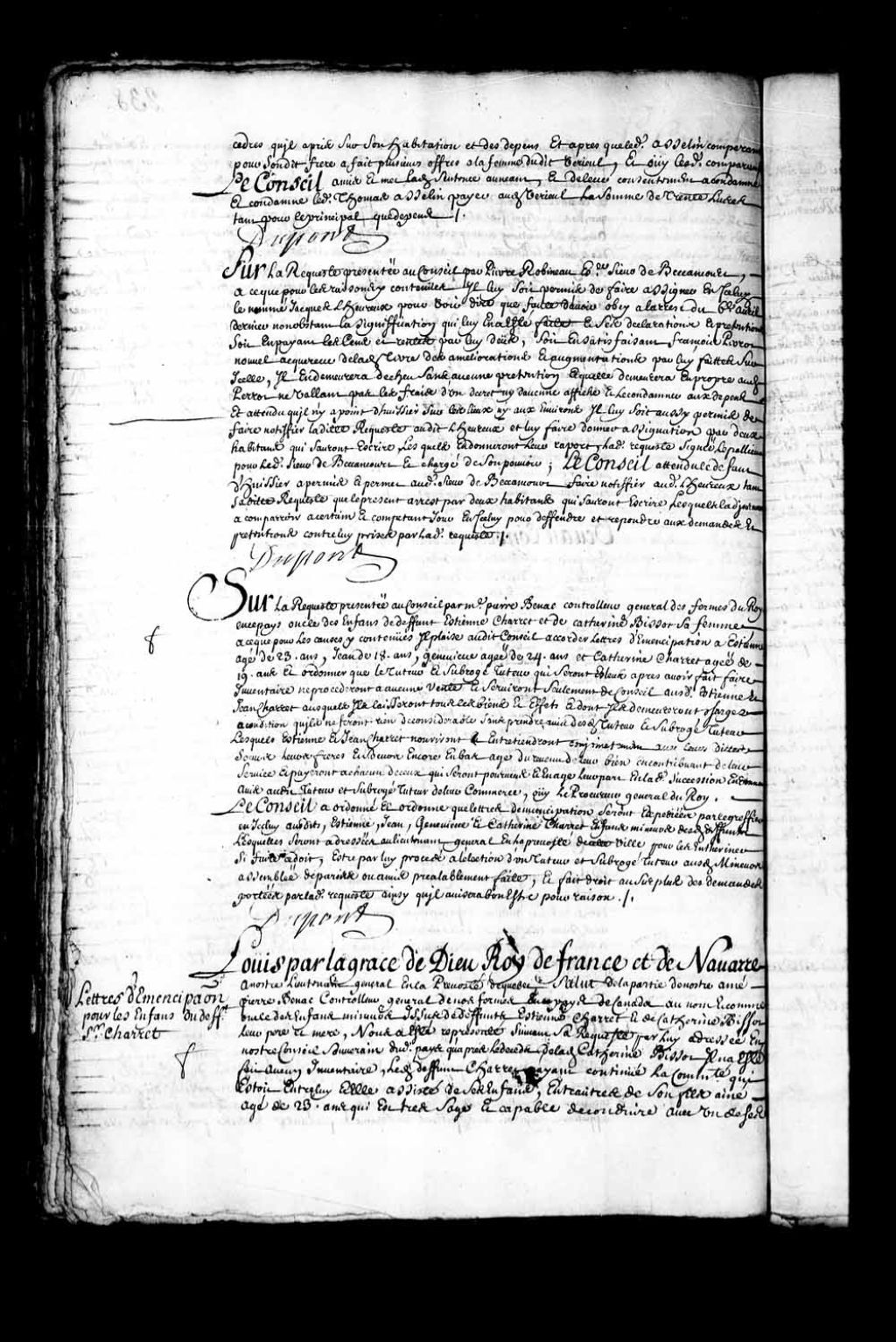 Transcription du texte avec orthographe modernisée : «Sur la requête présentée au Conseil par Pierre Robineau écuyer sieur de Beccancourt (Bécancour), à ce que pour les raisons y contenues, il lui soit permis de faire assigner en icelui le nommé Jacques L'heureux (Lereau, Levreau) pour voir dire que faute d'avoir obéi à l'arrêt du 6e avril dernier nonobstant la signification qui lui en a été faite et ses déclarations et prétentions soit en payant les cens et rentes par lui dus, soit en satisfaisant François Perrot nouvel acquéreur de ladite terre des améliorations et augmentations par lui faites sur icelle, il en demeurera déchu sans aucune prétention et qu'elle demeurera en propre audit Perrot ne valant pas les frais d'un décret ni d'aucune affiche et le condamner aux dépens et attendu qu'il n'y a point d'huissier sur les lieux ni aux environs il lui soit aussi permis de faire notifier ladite requête audit L'heureux (Lereau, Levreau) [...]
