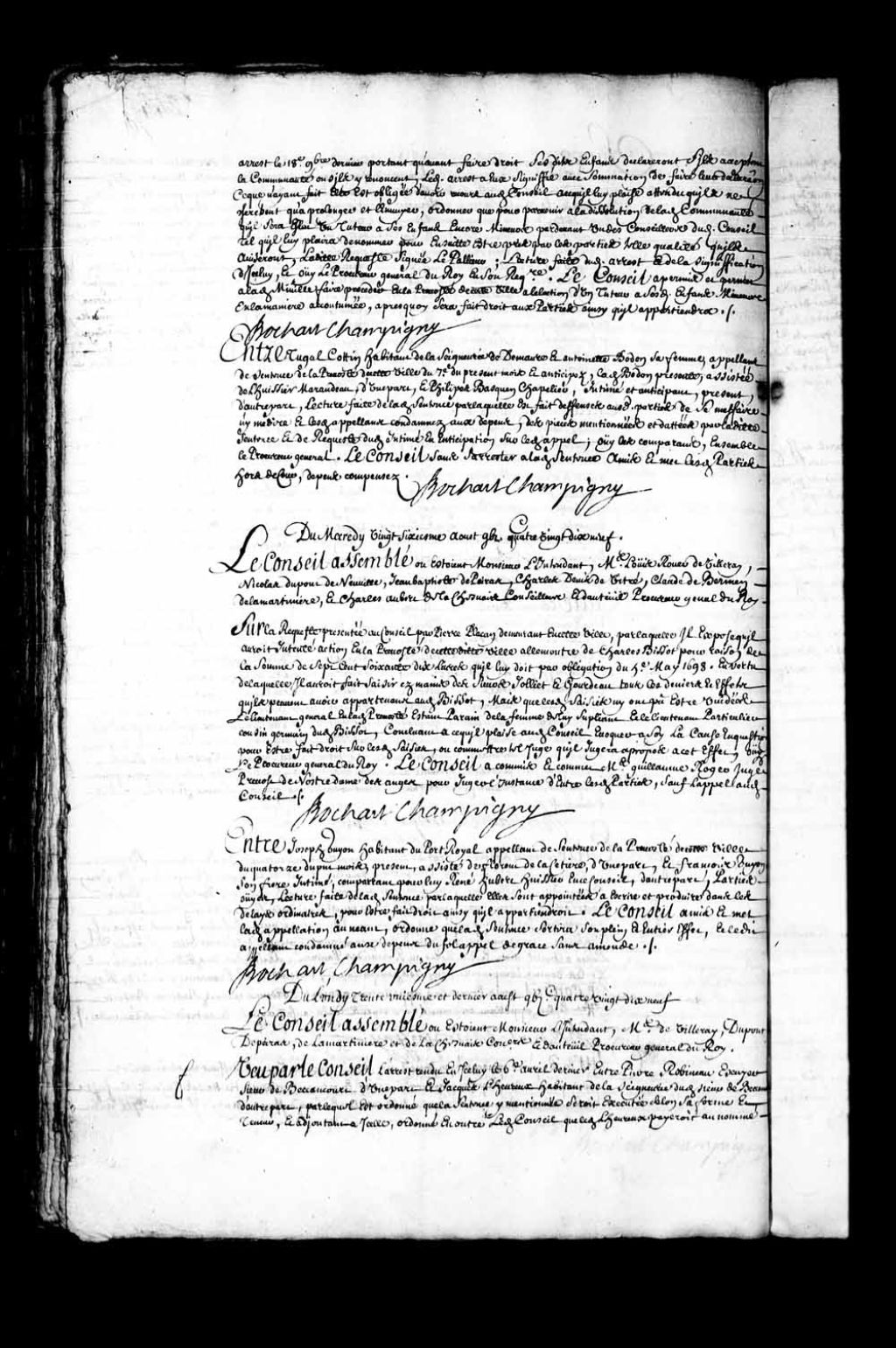 Transcription du texte avec orthographe modernisée : «Du lundi trente et unième et dernier août mille six cent quatre-vingt-dix-neuf. Le Conseil assemblé où étaient Monsieur l'intendant, maîtres de Villeray, Dupont, Depeiras, de La Martinière et de Lachesnais, conseillers et d'Auteuil procureur général du Roi. Vu par le Conseil l'arrêt rendu en icelui le 6e avril dernier entre Pierre ROBINEAU écuyer sieur de BECCANCOURT (Bécancour) d'une part et Jacques l'HEUREUX, habitant de la seigneurie dudit sieur de Beccancourt d'autre part, par lequel est ordonné que la sentence y mentionnée serait exécutée selon sa forme et teneur, et ajoutant à icelle, ordonné en outre ledit Conseil que ledit Lheureux payerait au nommé François Perrot aussi habitant dudit lieu nouvel acquéreur de la terre en question les augmentations et améliorations qu'il a fait sur icelle depuis qu'il en est en possession et ce dans la Saint-Jean-Baptiste dernière pour tout délai, les dépens de l'appellation compensés, ledit arrêt scellé et signifié au domicile élu par ledit L'heureux (Lereau, Levreau) en la maison de Jean Létourneau en cette ville le lendemain avec commandement d'y satisfaire par exploit de l'huissier LePallieur portant sommation audit L'heureux (Lereau, Levreau) de nommer une personne de sa part pour estimer lesdites augmentations et améliorations comme ledit sieur de Beccancourt nomme de la sienne Sébastien Provenché (Provencher) habitant du cap de la Madeleine, qu'autrement et à faute de ce faire qu'il se pourvoirait en ce Conseil pour en être nommé d'office, les pièces mentionnées et datées audit arrêt; autre arrêt du sixième juillet dernier portant permission audit sieur de Beccancourt attendu le défaut d'huissiers sur les lieux, faire notifier audit L'heureux (Lereau, Levreau) tant la requête dudit sieur de Beccancourt y énoncée que ledit arrêt par deux habitants qui sauraient écrire lesquels l'ajourneraient à certain et compétent jour en ce Conseil pour répondre aux conclusions contre lui prises par ladite requête, ledit arrêt et requête signifiés audit L'heureux (Lereau, Levreau) parlant à sa personne trouvée aux Trois-Rivières par Ameau huissier. Le treizième dudit mois, avec assignation dudit jour en quinzaine en ce dit Conseil pour répondre aux demandes et prétentions dudit sieur de Beccancourt portée par ladite requête et sommations; autre arrêt du 27e dudit mois de juillet par lequel ledit Conseil a nommé d'office le sieur Gastineau l'aîné pour estimer avec ledit Provenché lesdites augmentations et améliorations faute d'avoir par ledit L'heureux (Lereau, Levreau) nommé de sa part un expert pour ce faire et permis audit sieur de Beccancourt faire assigner ledit L'heureux (Lereau, Levreau) à certain et compétent jour conformément audit arrêt du sixième dudit mois pour voir ordonner ce que de raison, signifié par ledit Ameau audit L'heureux (Lereau, Levreau) parlant à la femme du sieur Cournoyer en sa maison en laquelle il a fait élection de domicile audit lieu des Trois-Rivières, et le procès-verbal d'estimation desdites augmentations et améliorations faits par ledit Gastineau (Gatineau) et Michel Lefebvre, habitant desdites Trois-Rivières au lieu et place dudit Provenché à cause de sa maladie qui la empêché de pouvoir aller sur les lieux en date du 20e du présent mois, ouï ledit sieur de Beccancourt qui a demandé défaut portant profit à l'encontre dudit Lheureux attendu ses subterfuges et qu'il ne tient aucun compte de satisfaire auxdits arrêts et assignations. Le Conseil a donné défaut audit sieur de Beccancourt contre ledit Lheureux défaillant, et pour le profit a condamné et condamne ledit Lheureux payer dans un mois de ce jourd'hui audit sieur de Beccancourt les cens et rentes et autres sommes qu'il lui peut devoir suivant et conformément audit arrêt du 6e avril dernier, et audit Perrot la somme de deux cent quatre-vingt livres tant pour lesdites améliorations qu'une maison faite par ledit Perrot sur ladite terre suivant ledit procès-verbal, non compris les grains qui sont actuellement pendant par les racines sur icelle et pour vingt-huit livres de bois de charpente qui est sur la place destiné à faire une grange lesquels appartiendront audit Perrot pour en disposer ainsi que bon lui semblera, sinon et à faute de ce faire et ledit temps passé ledit L'heureux (Lereau, Levreau) demeurera déchu de ladite terre laquelle appartiendra audit Perrot en pleine propriété à l'avenir pour en jouir par lui conformément au contrat de concession que lui en a fait ledit sieur de Beccancourt, et ledit Lheureux aux dépens qui ont été faits depuis ledit arrêt du 6e juillet et signification d'icelui. BOCHART CHAMPIGNY.»
