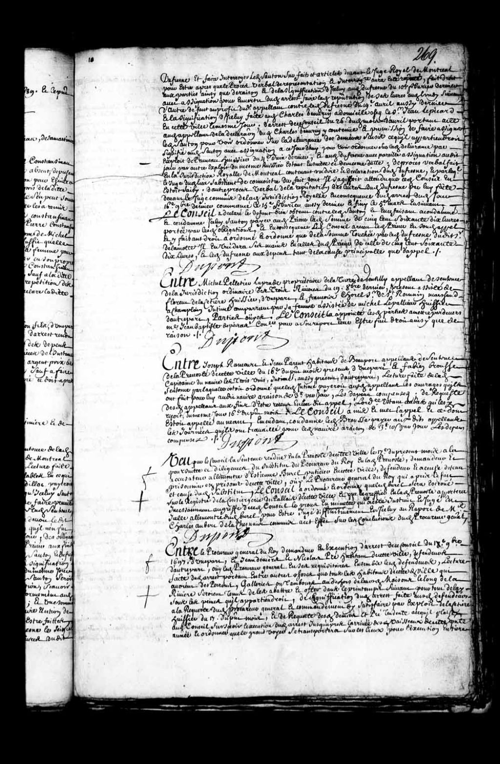 Transcription du texte avec orthographe modernisée : «Entre Michel PELLETIER LAPRADE propriétaire de la terre de Gentilly appelant de sentence de la juridiction ordinaire des Trois-Rivières du 19 octobre dernier, présent assisté de Florent de LaCetière huissier, d'une part, et François CHOREL sieur de Saint-Romain marchand à Champlain intimé comparant par sa femme assistée de Michel Lepallieur huissier d'autre part. Parties ouïes, le Conseil a appointé lesdites parties à mettre par devers maître Jean-Baptiste Depeiras conseiller pour à son rapport leur être fait droit ainsi que de raison. DUPONT.»