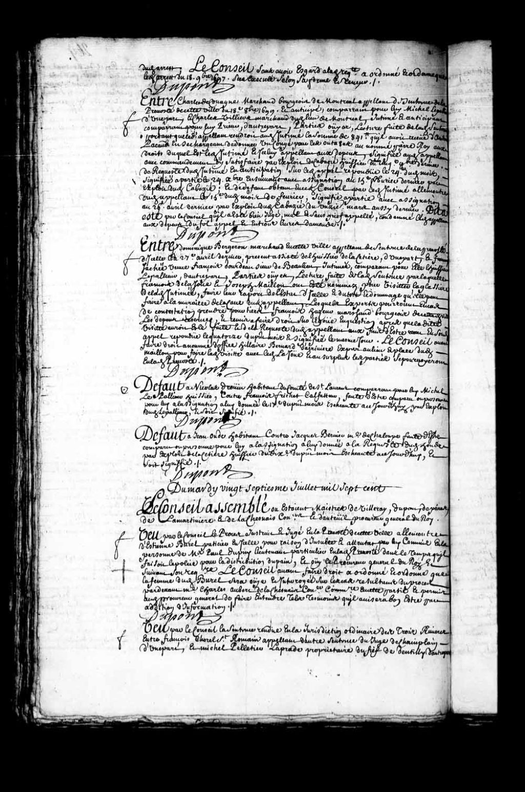Transcription du texte avec orthographe modernisée : «Du mardi vingt-septième juillet mille sept cent. Le Conseil assemblé où étaient maîtres de Villeray, Dupont, Depeiras, de La Martinière, et de Lachesnais conseillers et d'Auteuil procureur général du Roi. Vu par le Conseil le procès instruit et jugé en la prévôté de cette ville à l'encontre de Etienne Burel pâtissier en icelle pour raison d'insulte et attentat par lui commis en la personne de maître Paul Dupuy lieutenant particulier en ladite prévôté dans le temps qu'il faisait la police pour la distribution du pain, et ouï le procureur général du Roi et suivant son réquisitoire, le Conseil avant faire droit a ordonné et ordonne que la femme dudit Burel sera ouïe et interrogée sur les cas résultant du procès par-devant maître Charles Aubert de Lachesnais conseiller commissaire en cette partie et permis audit procureur général de faire entendre tels témoins qu'il avisera bon être par
